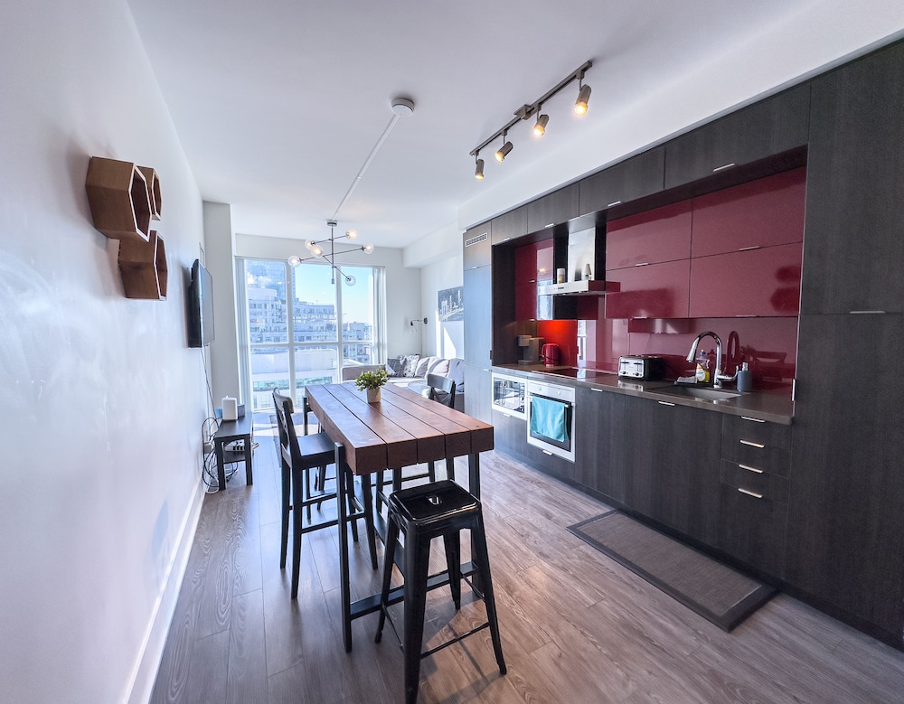 We were moved to a different property after a maintenance issue with this place. I can’t compare it but I was hoping it would be as nice as the original pictures and it did not meet expectations. The unit we stayed in was suitable enough for us, and conveniently located. It was just a little dated. Replace the remote control for the tv instead of keeping the batteries taped on, they kept popping out. There was no filter in the water pitcher. Dirty under the beds. The biggest negatives of the building were the elevators, parking garage, and noise level. The wait was usually several minutes to get off and on. Being from the US, I don’t know if the security measures are like this in all buildings in Toronto but having to use the key fob for the elevator was frustrating. We left some food items in our room after checkout and could not get back on the elevator to go retrieve them. Tried buzzing the owner but there was no answer. The parking spots were confusing to find and signage to exit and get out was difficult. We didn’t spend much time in our room, but the accommodations just made the stay a little less pleasant, and it was hard to sleep with the train and other tenants above and beside being noisy late at night.