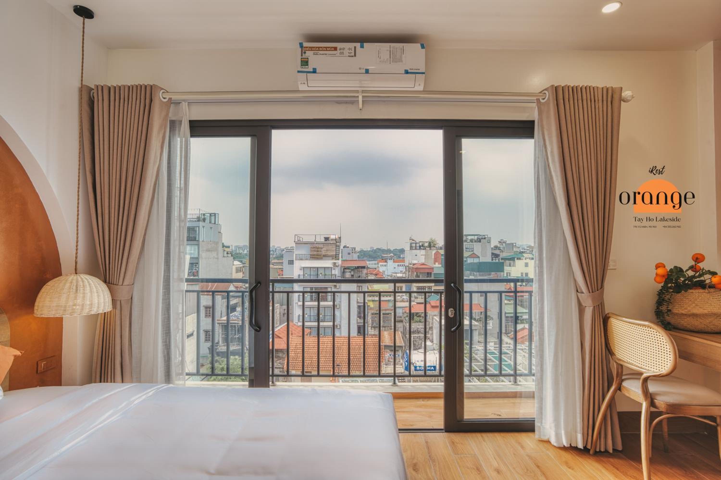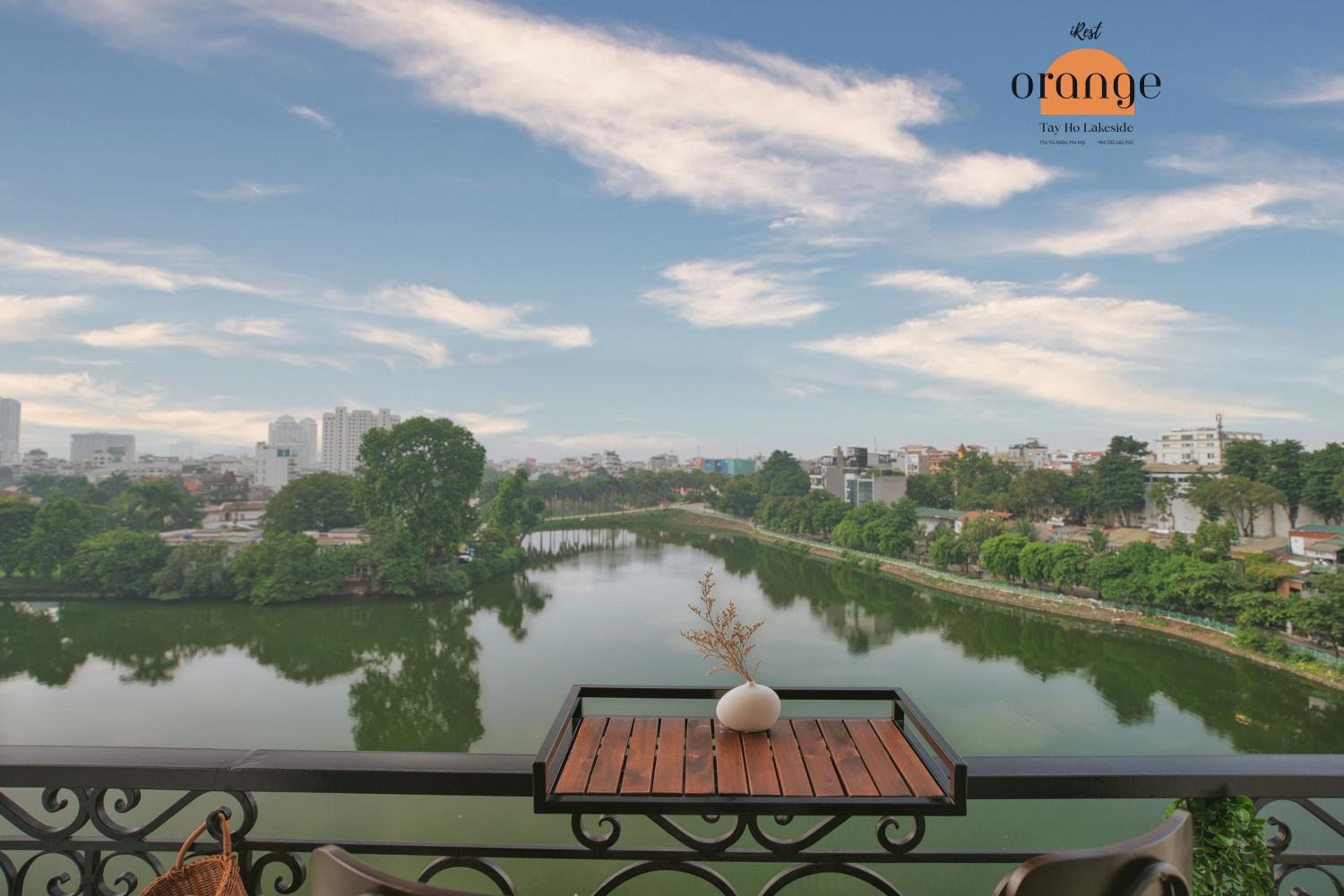 Enjoy stunning views of the serene West Lake from the comfort of your balcony at iRest Orange Tay Ho Lakeside Apartment.