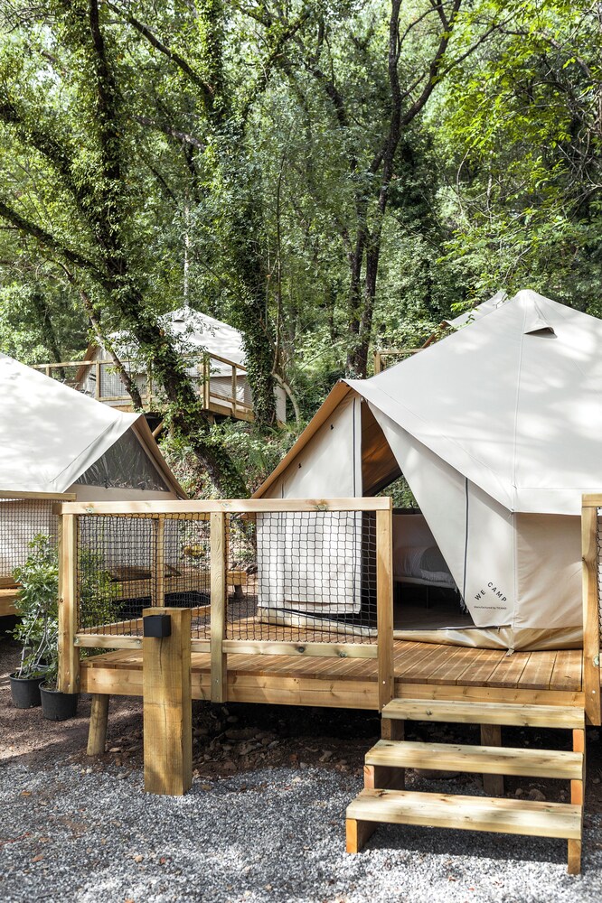 We spent a fantastic 6 nights staying on the We Camp Pyrenees site in mid july. For a family of 4 we had a 2 bed cabin with it's own toilet and shower, small kitchen and aircon. Spacious enough for us and had a lovely terrace to sit on. Kitchen area had enough to do simple meals, small microwave, 2 ring hob. We had a pod coffee machine but, I don't think all properties had this. No kettle. Towels were provided. The site was lovely, small shop with fresh bread and pastries (best to reserve what you want the day before). Also sold drinks, crisps, household items and bits and bobs. Supermarket approx 1.5 mile away. Pizza restaurant on site which we didn't have time to try, but looked very good. It was closed a couple of nights due to short staff. Also, brilliant small restaurant short walk away which served Tapas, burgers, traditional spanish food and milkshakes which were all delicious. The campsite was lovely, peaceful and the pool area ideal for kids with 3 slides that entertained us. No inflatables allowed and people do adhere to this. Lifeguard on duty at all times. Also a paddle court on site (can hire rackets and buy balls), football area, table tennis. All the staff were super helpful. Other facilities on site all clean and well maintained such as shower block etc. Also had a washing machine (5 euro large load) and dryer (4 euro) which was handy.