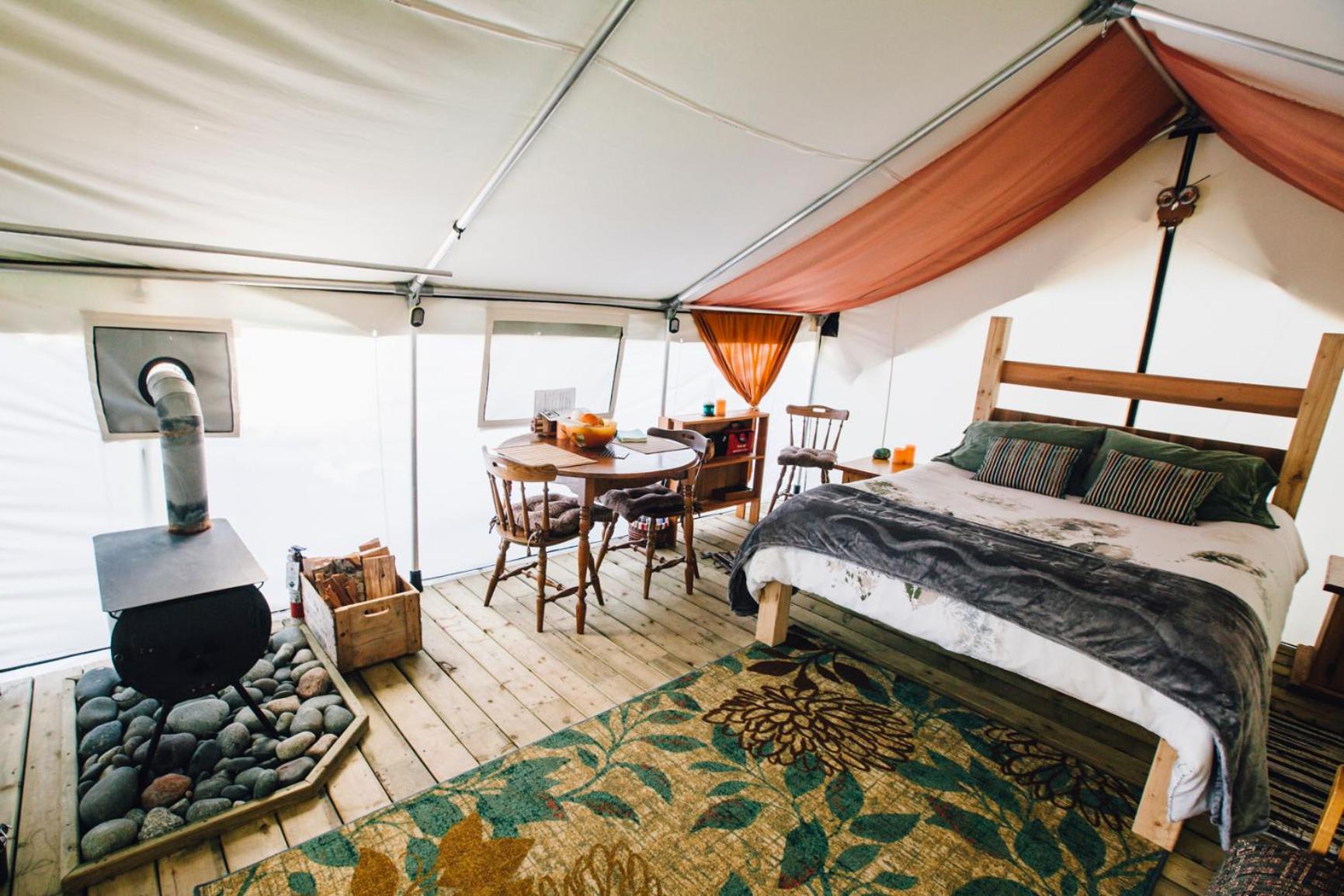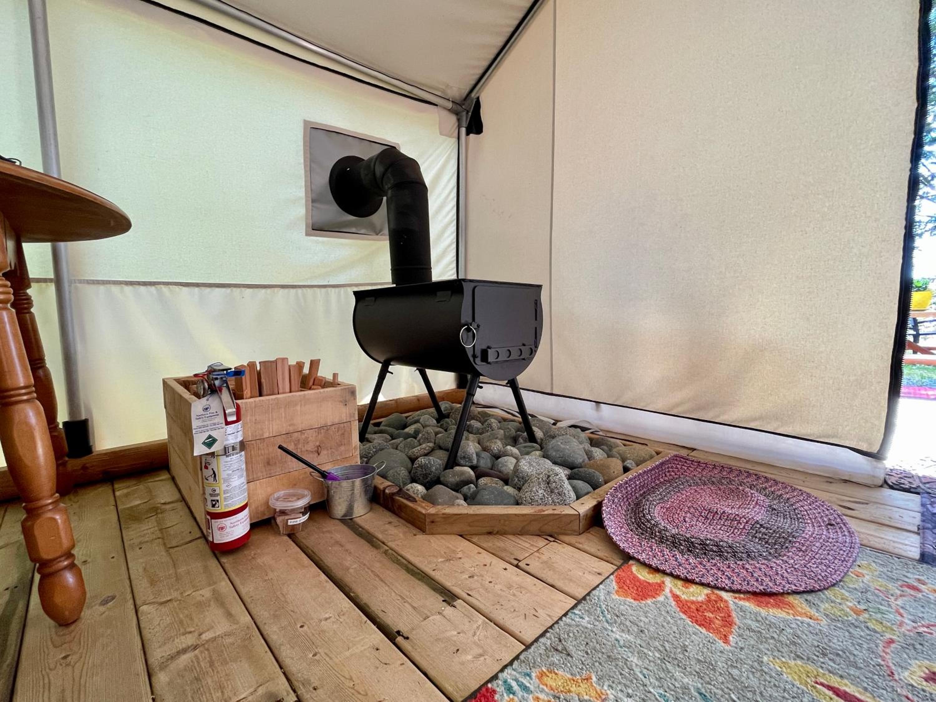 L’endroit isolé, la vue, le Glamping, tous les équipements, la literie, le poêle à bois essentiel dans la tente …