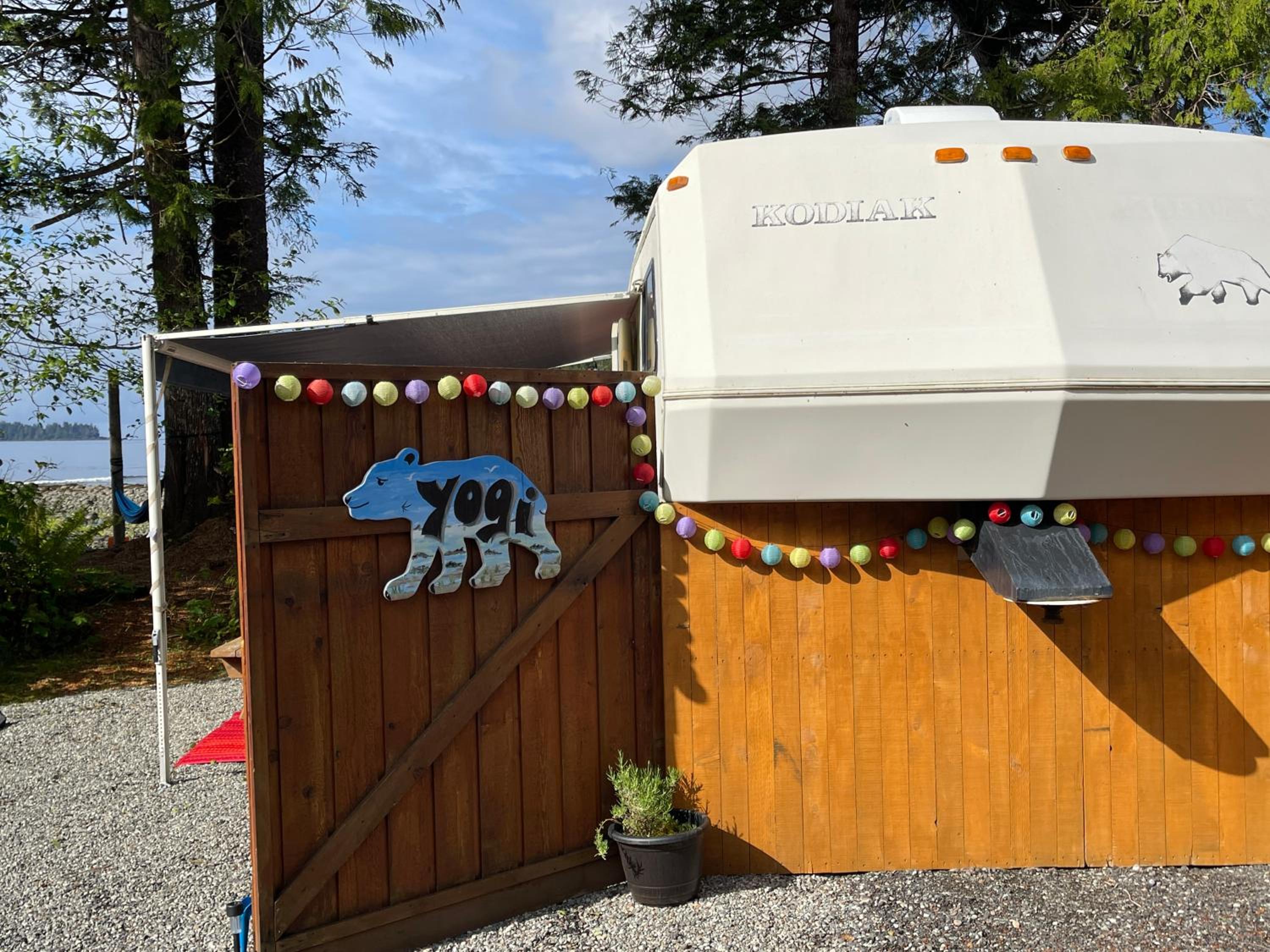 Vous ne pouvez pas être plus près de la nature . Nous avions un petit trailor où chaque objet avait à sa place et tout a été pensé pour votre confort ! Les douches étaient à température idéale ! Et nous avons rencontré un ours sur la route en partant du site !