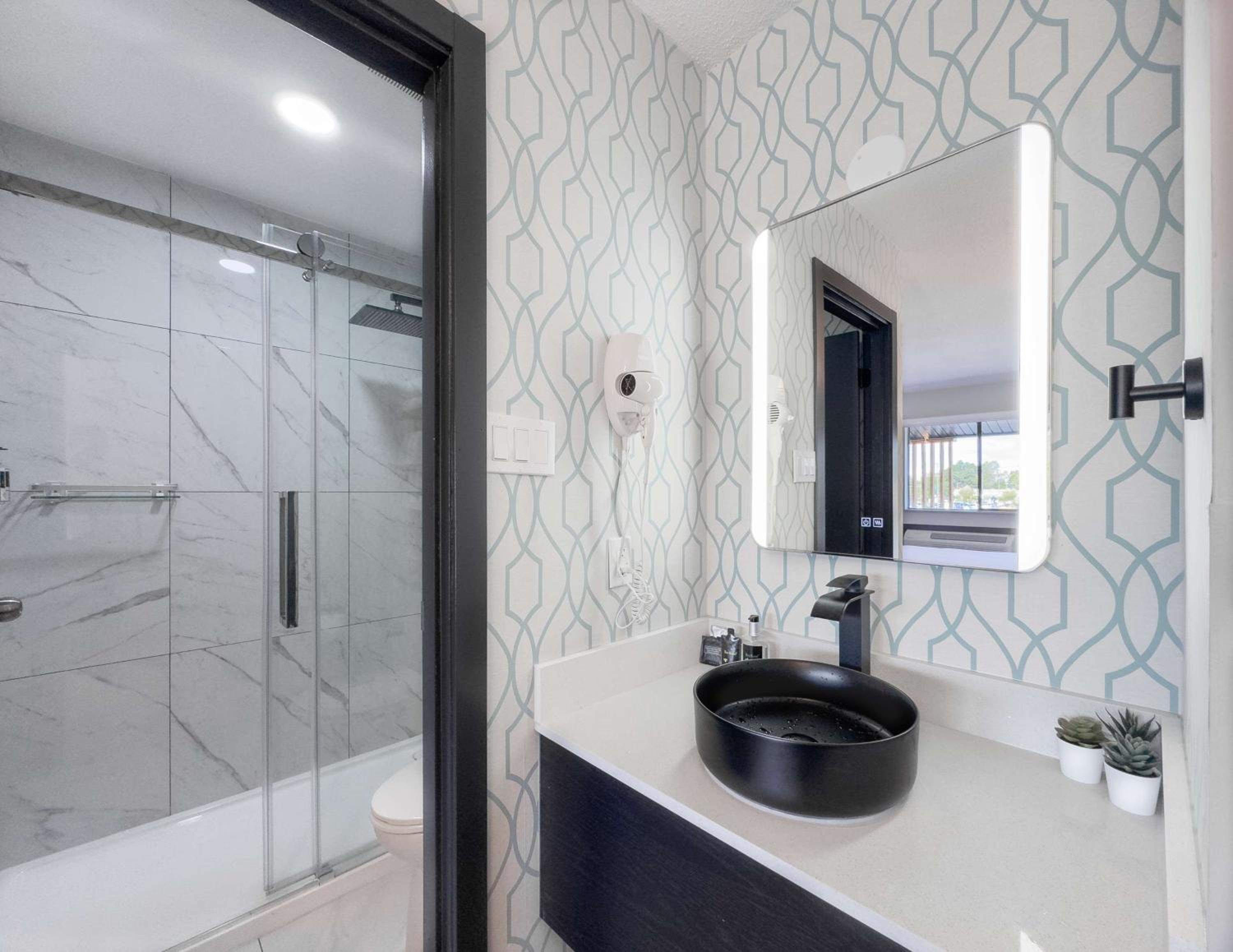 The bathroom was nice and new. staff are exceptionally friendly, and having sports game on in the lobby was nice.