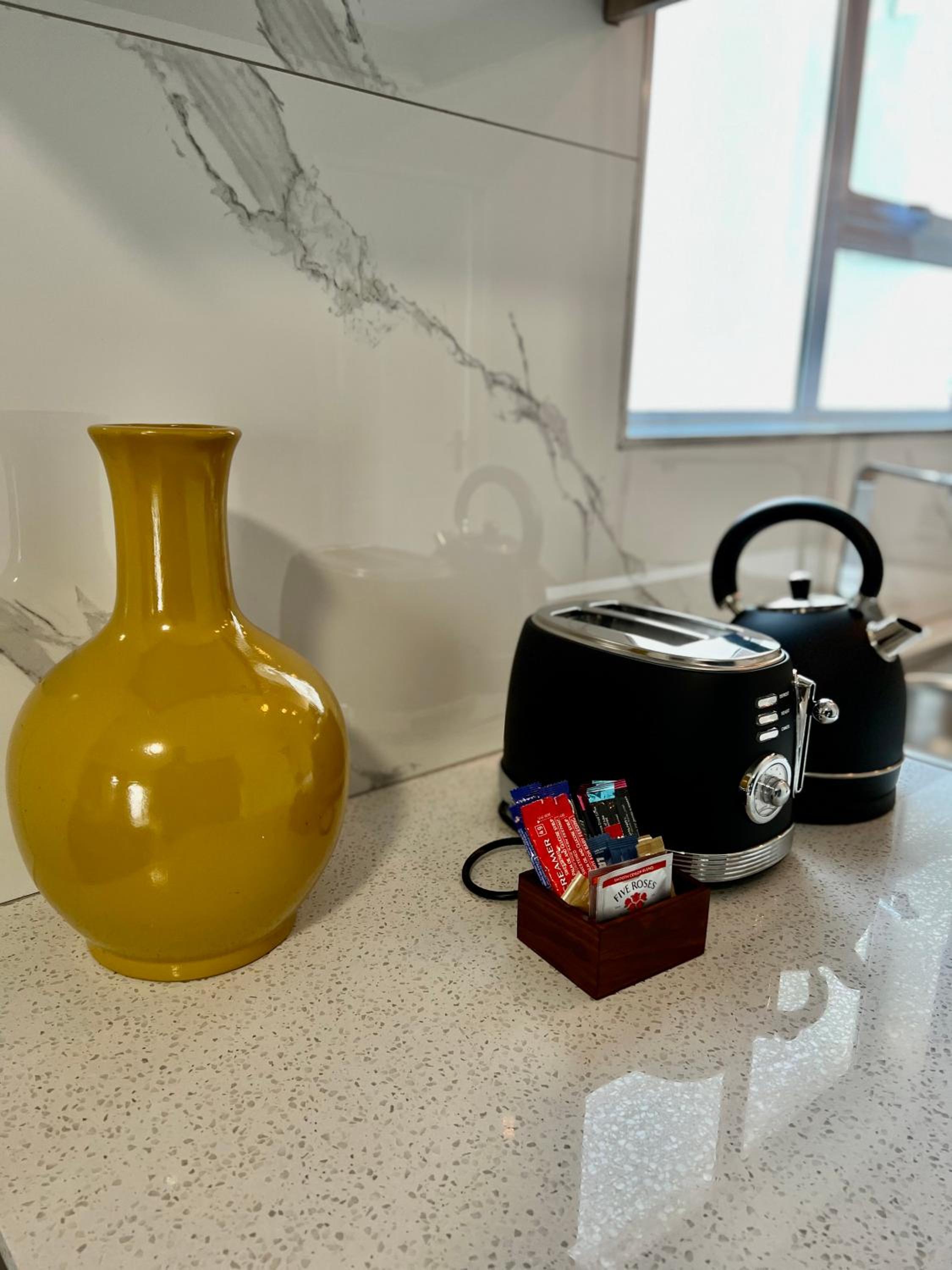 I also wish more tolitries could be added apart from shower gel only, a lotion and shower caps would complement the beauty of the bathroom better and more towels.