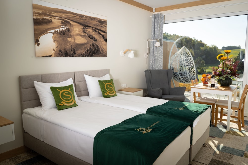 Vi spelade golf på en fantastisk bana i toppskick och bodde sedan i en bungalow på anläggningen. Bra service och lugnt , rekommenderas varmt.