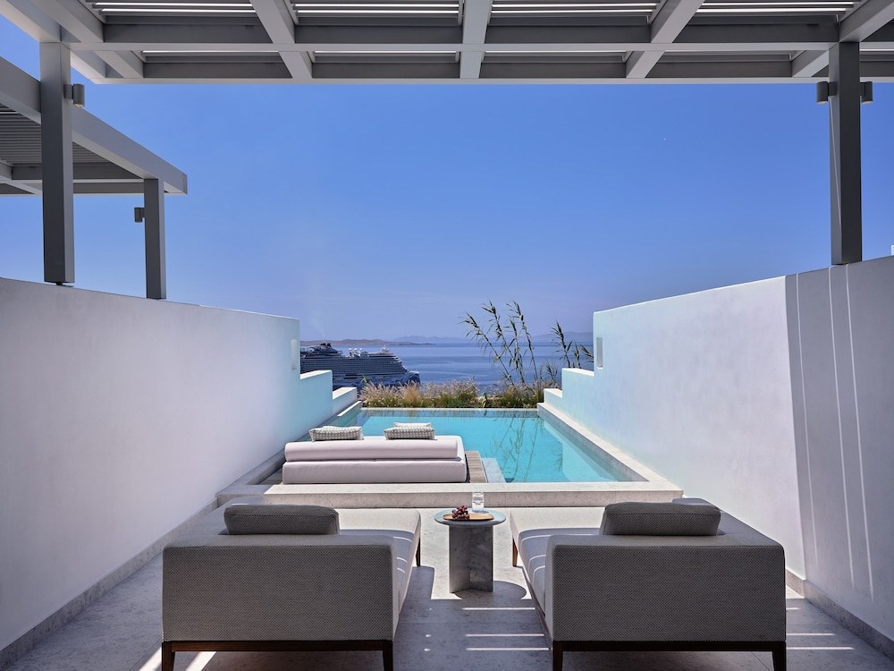 This is a 5 star hotel the amenities are great. Food is fantastic. The location is awesome, away from the bustle of Mykonos town but a nice walk if you want some noise.