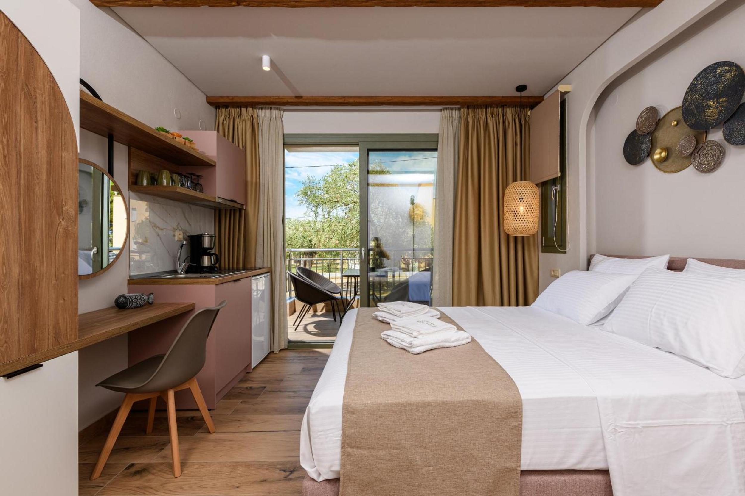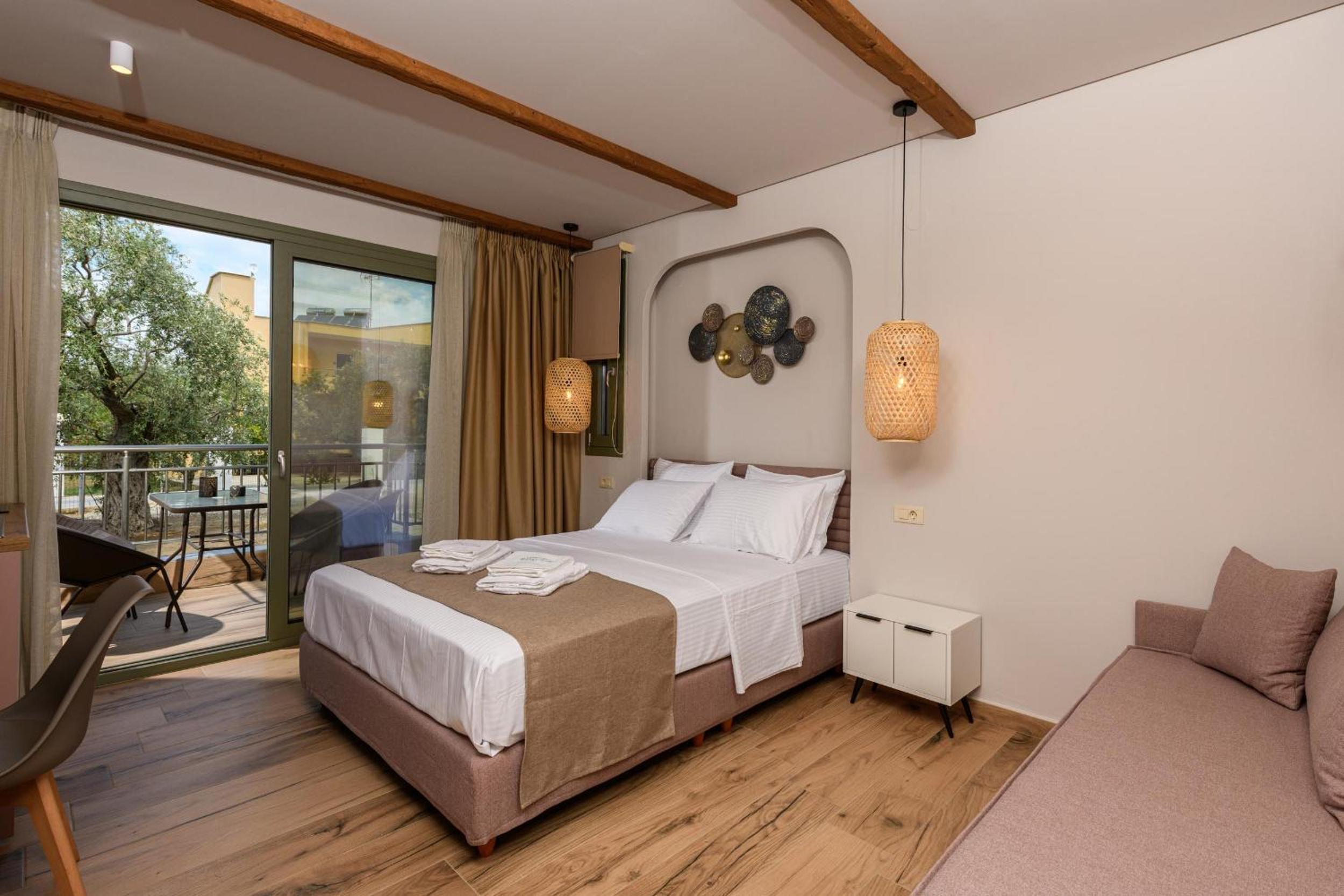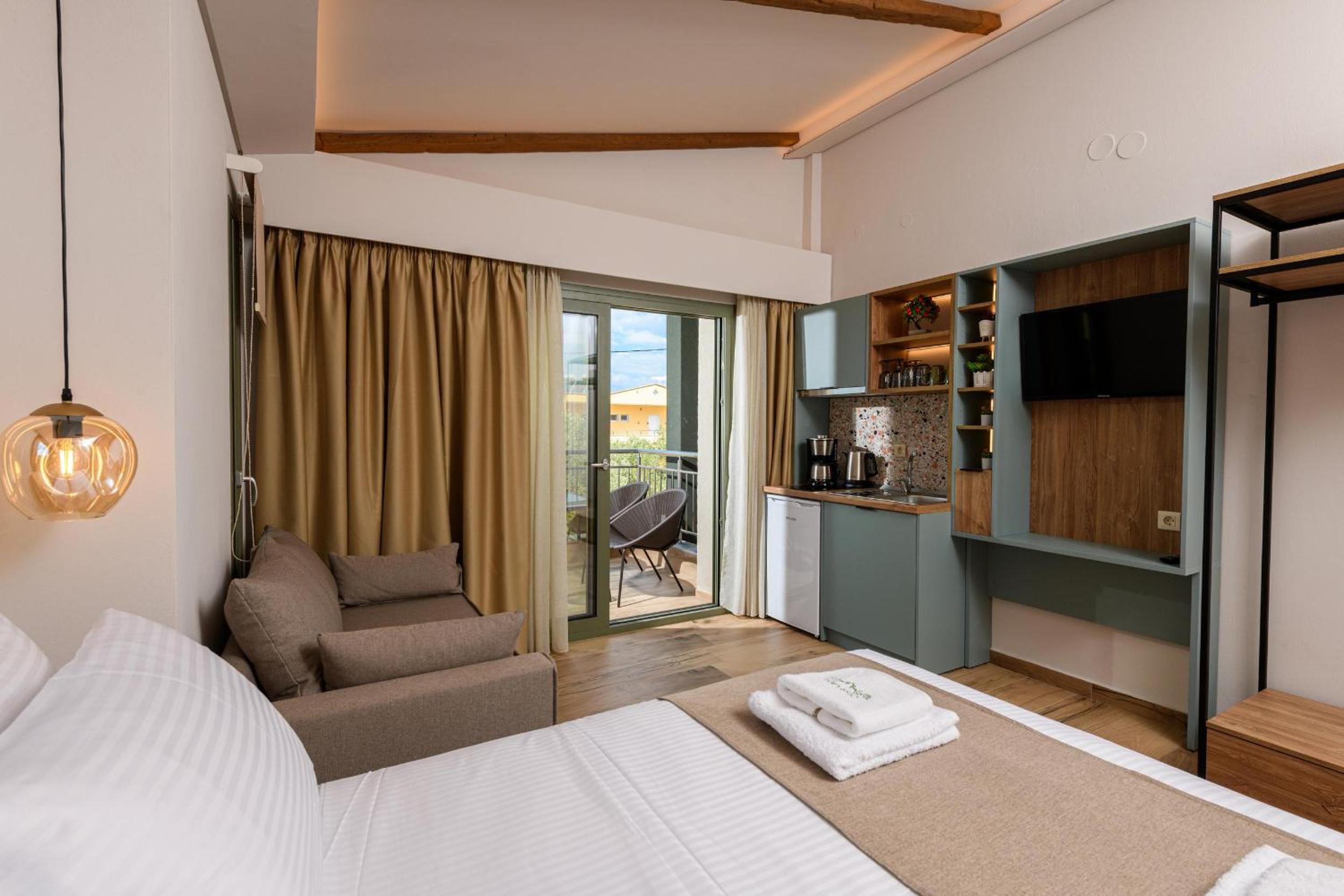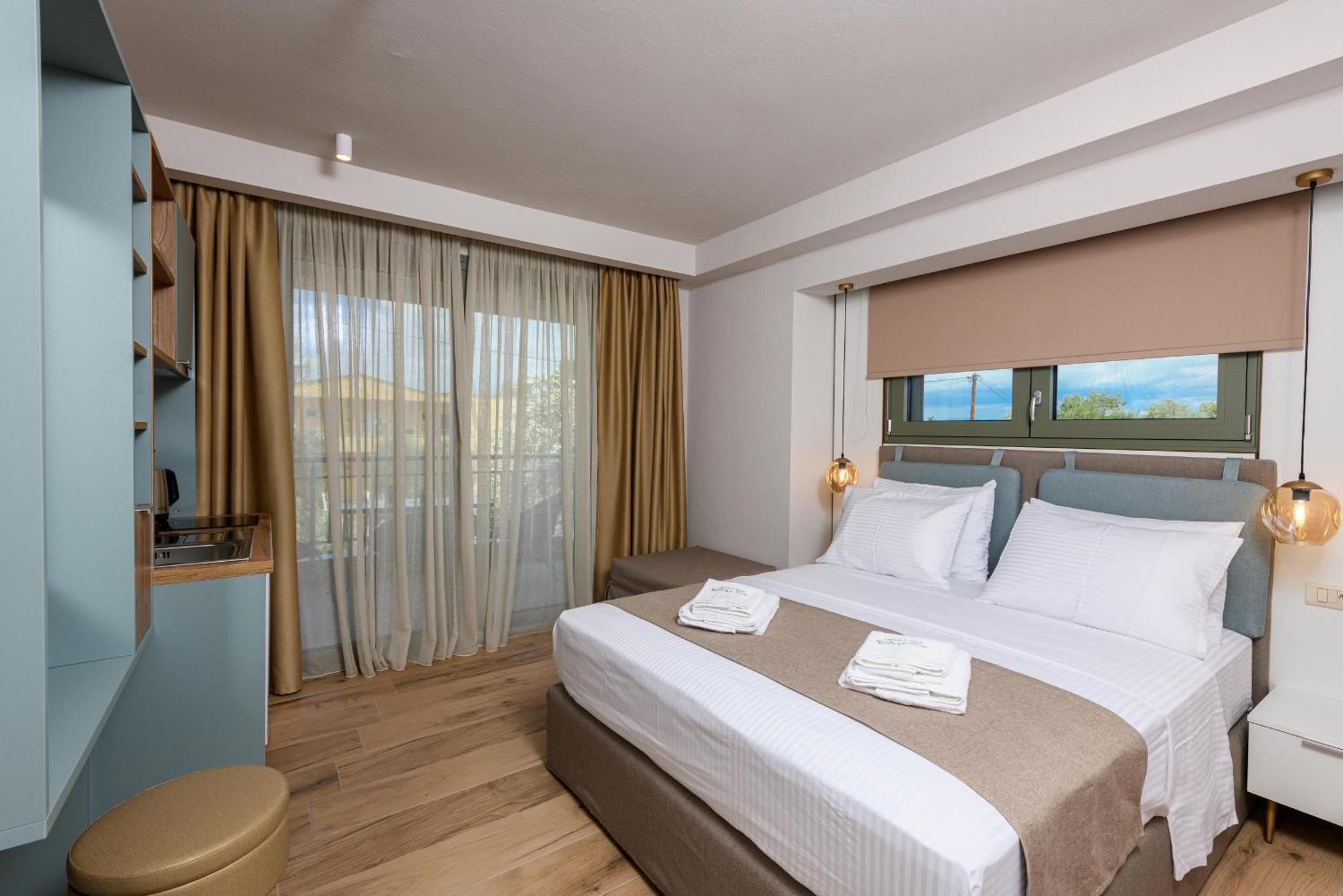 Hotel is new, bed is fantastic, cleaning is daily (!), staff are great, garden is relaxing and watered daily calmly, location is walking distance to beach (really relaxing and affordable beach, authentic greek, location is quietand resting.
