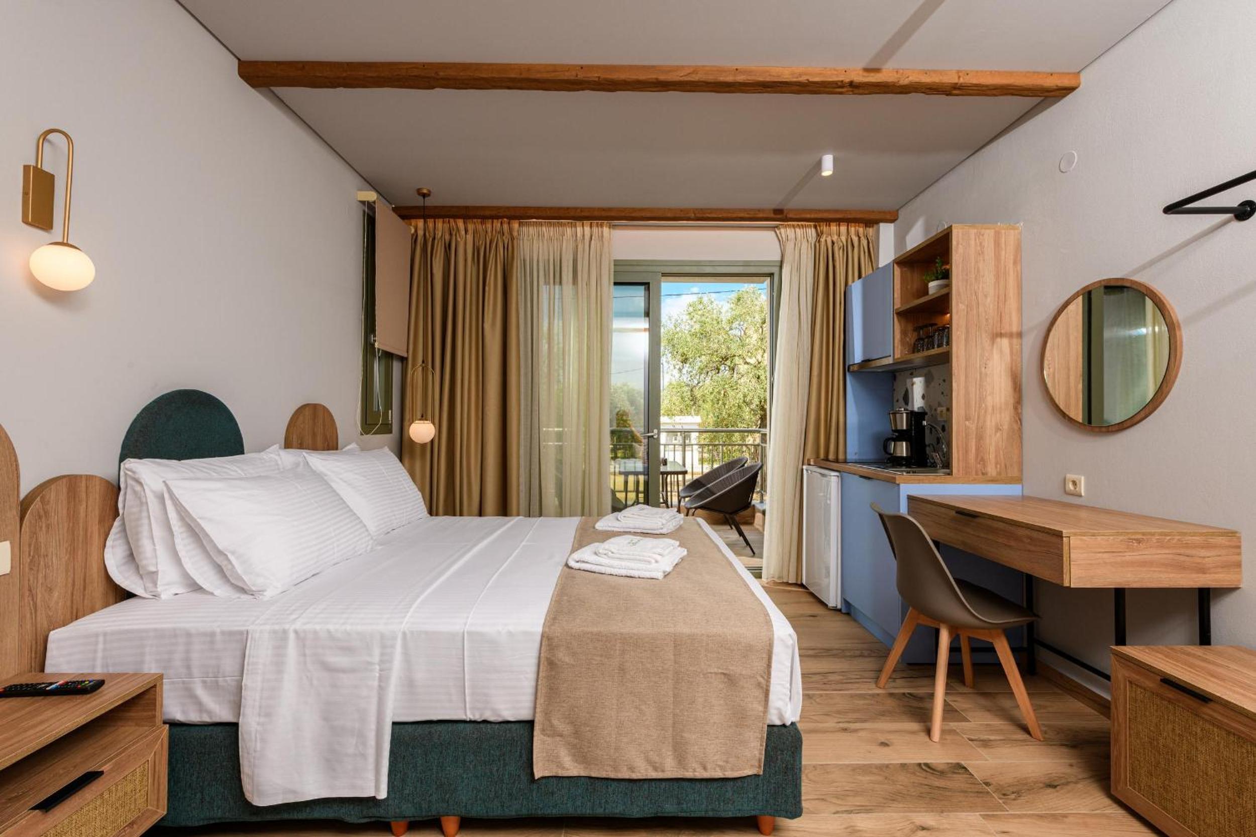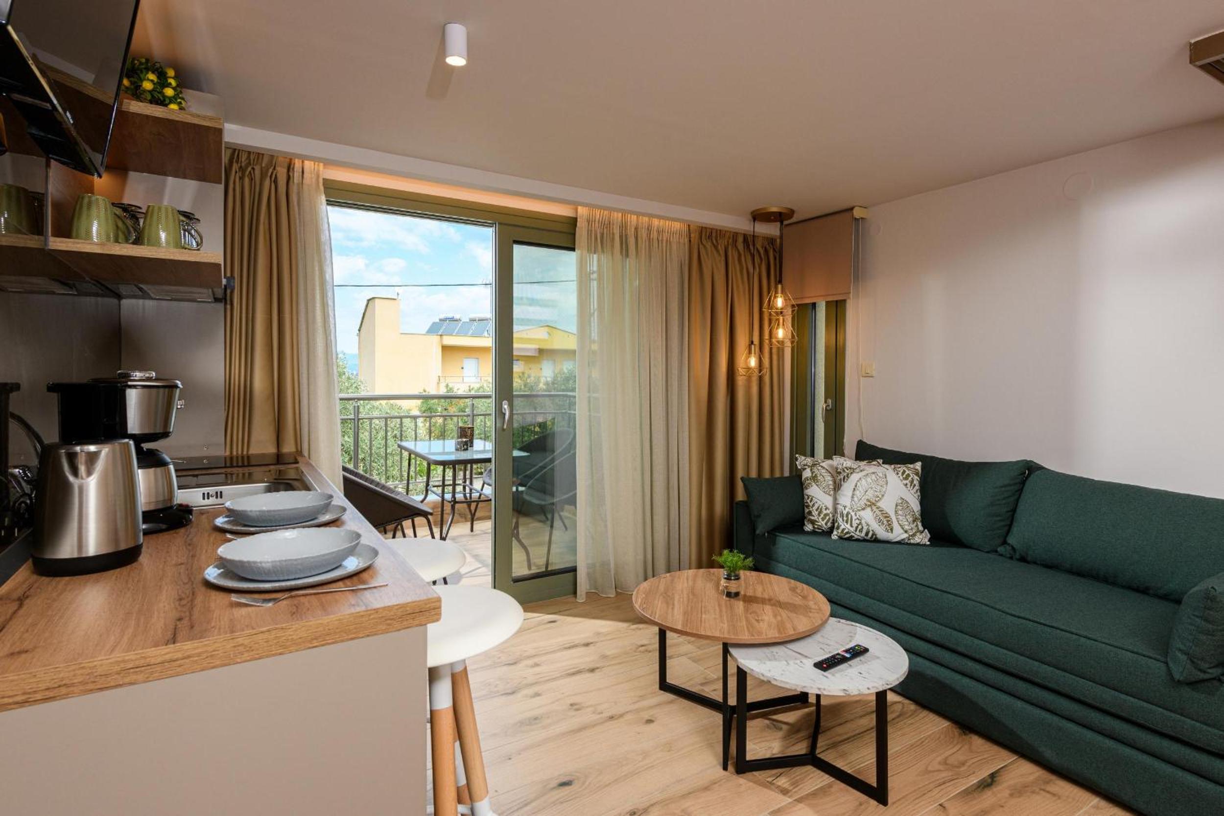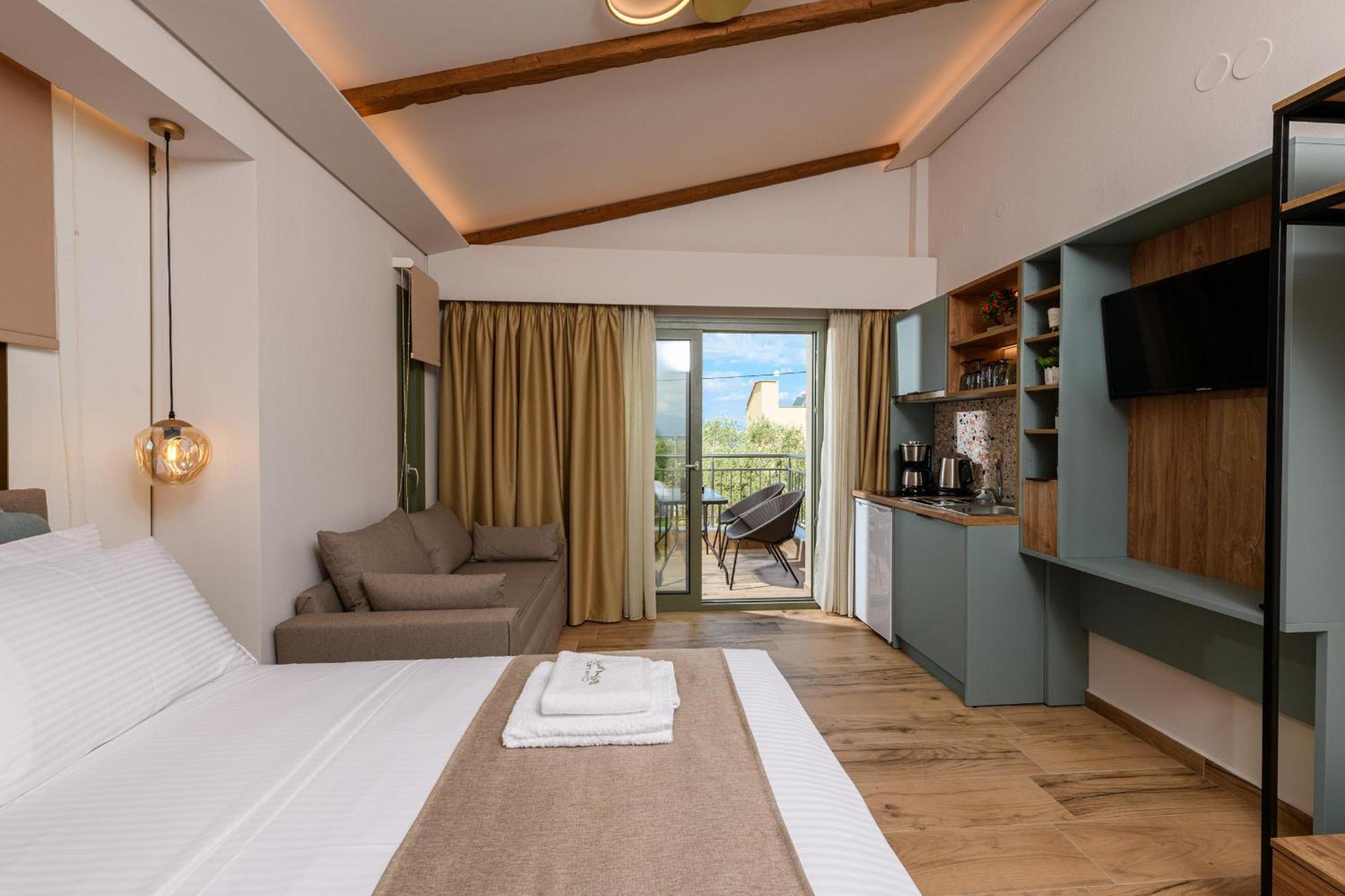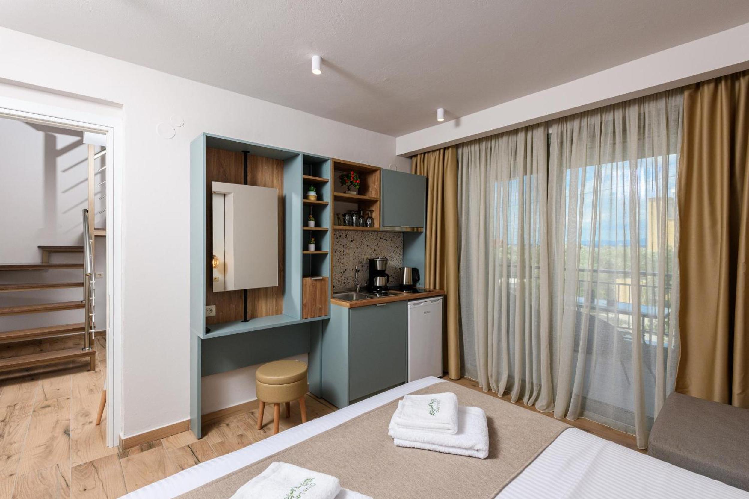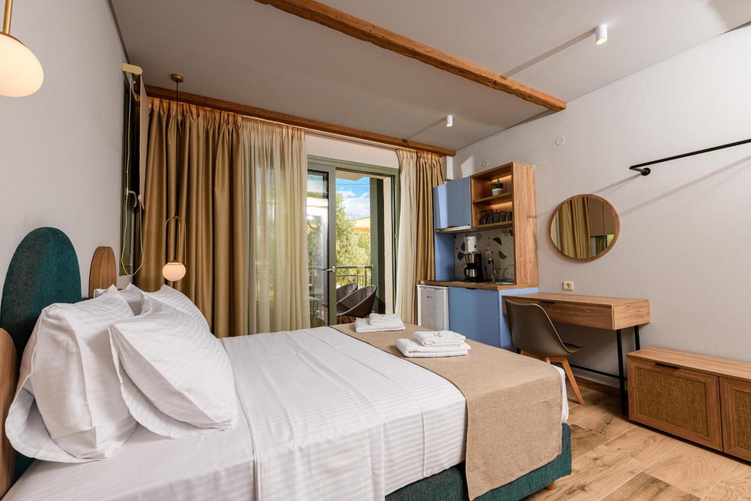 Hotel is new, bed is fantastic, cleaning is daily (!), staff are great, garden is relaxing and watered daily calmly, location is walking distance to beach (really relaxing and affordable beach, authentic greek, location is quietand resting.