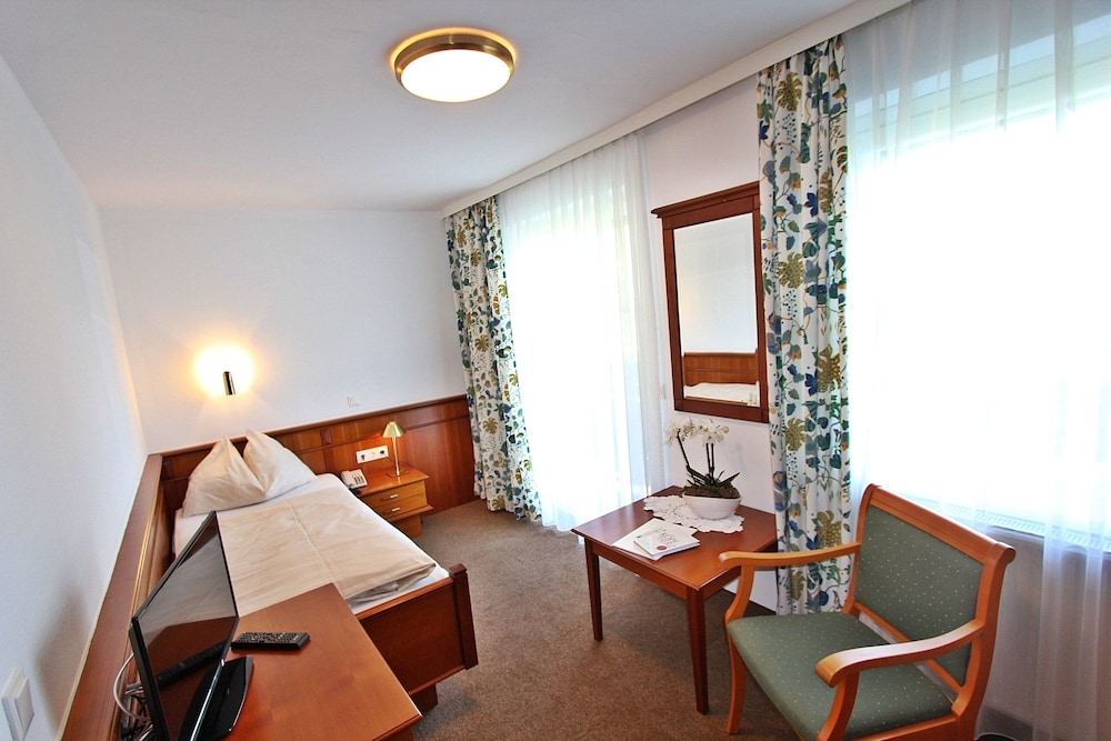 Everything was just fine during our 5 days holiday. We could choose between two upgraded rooms. Nearby church bells hardly audible in the morning when windows were closed. We got a pack of useful information material when checking in. Breakfast and half board excellent. Fast Wi-fi in the room. Friendly staff in the restaurant. Sauna working. Enough parking space.