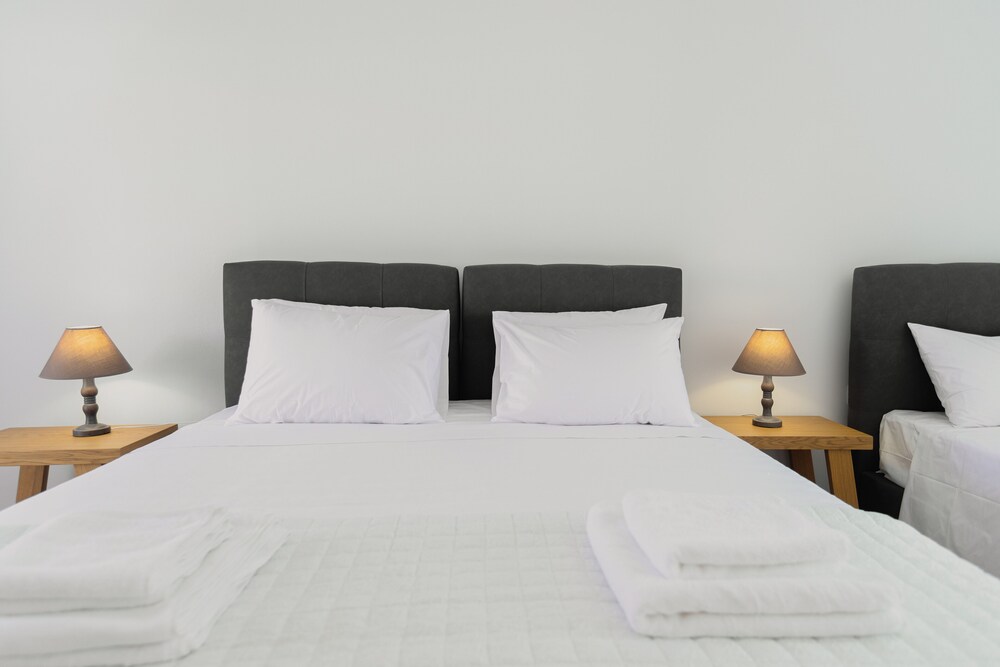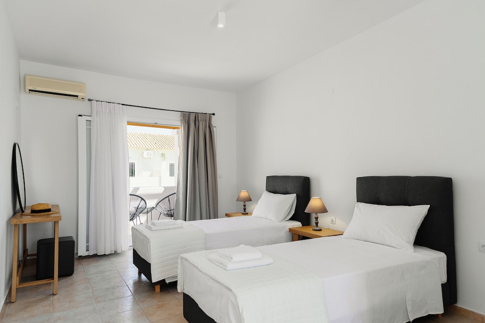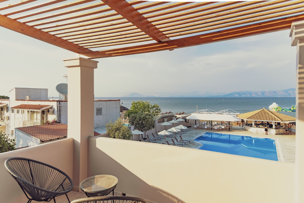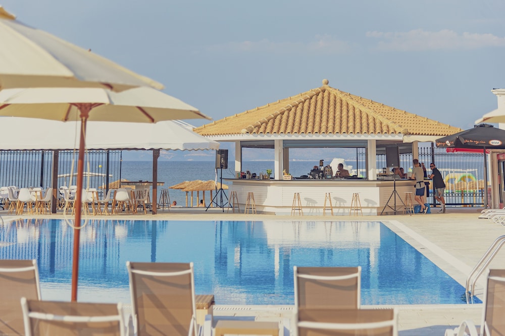 Extremt nära till stranden, trevligt med pool, finns AC och kyl som är otroligt viktigt i Greklandvärmen. Bra priser i restaurangen. Stor pool. Gott om solstolar vid stranden för alla.