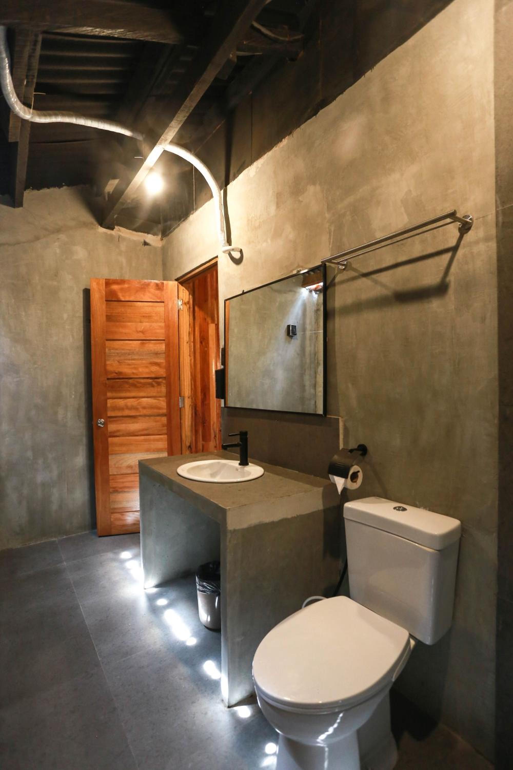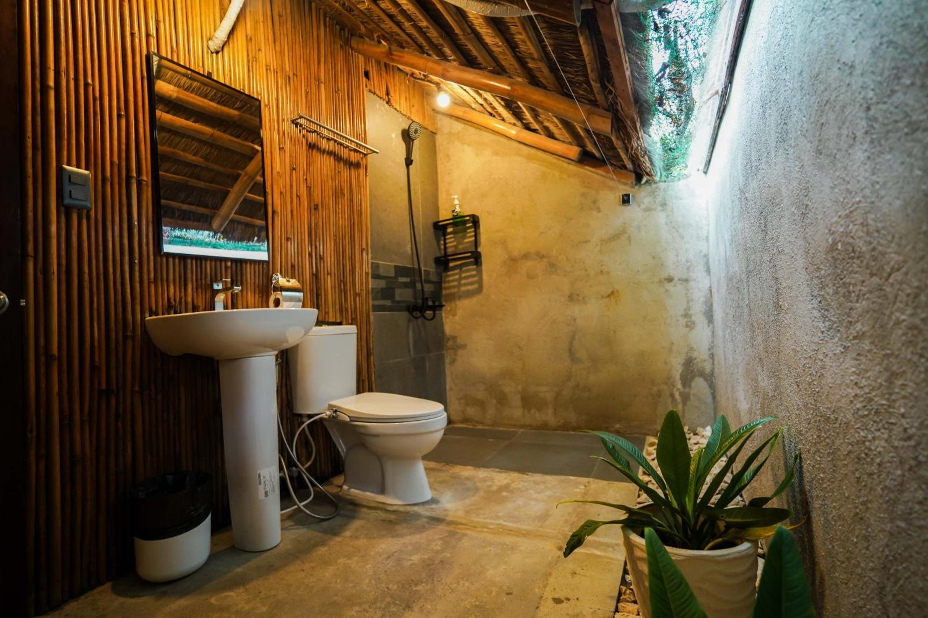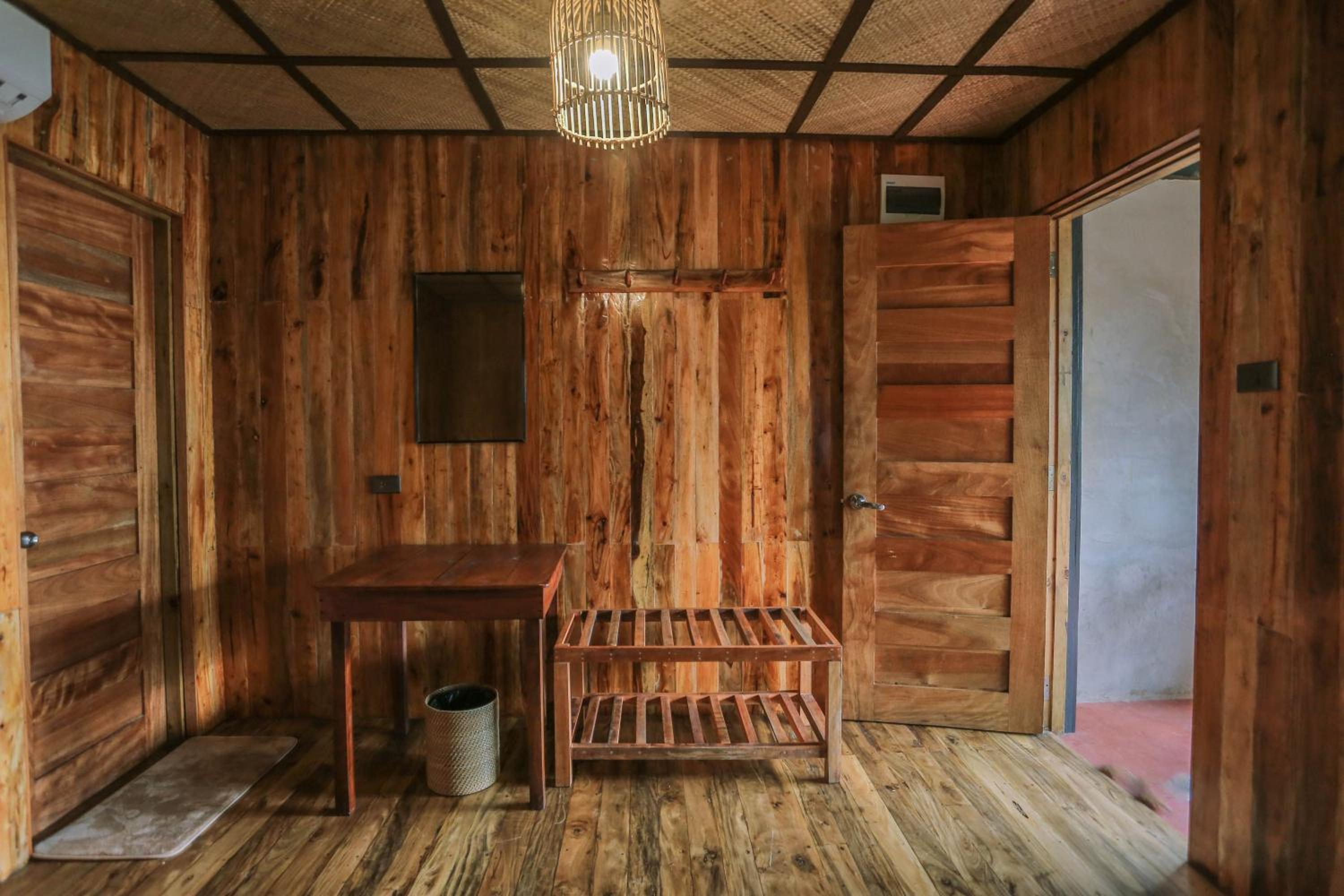 - It's made either by bamboo or wood but lack of maintenance. There are lot moisture in the room which you can smell and feel right after walking in. It's added by the fact that the bathroom's roof is half open which is always wet.