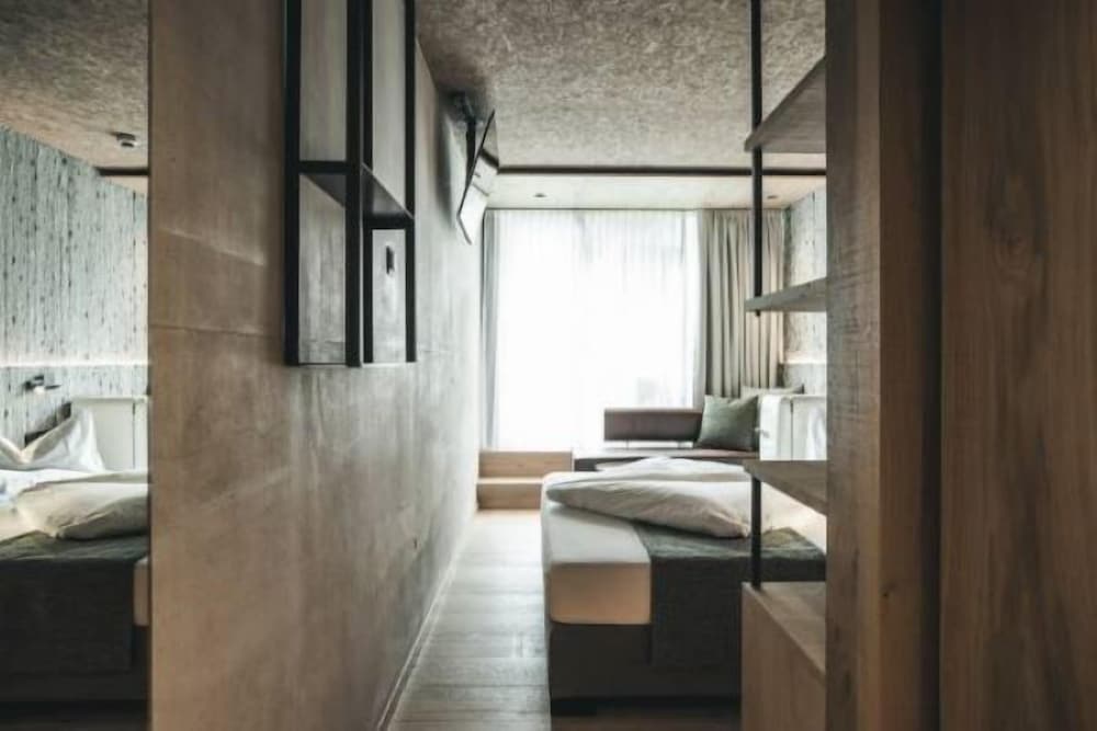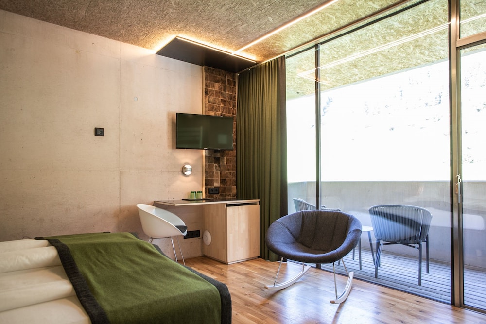 This was great hotel for our ski vacation and would come back to it anytime in the area. Quiet location, ski in/ski out, interesting design concept with the walls and ceilings having an "unfinished look" but with all other modern features; rooms may seem a bit smaller but there's plenty of closet space and shelves, thus no clutter; nice and helpful staff, great service. Ski room is big, modern and well organized but if you plan to ski during the same day you check out, the area provided to change and shower it's really small and disappointing for such a nice hotel.