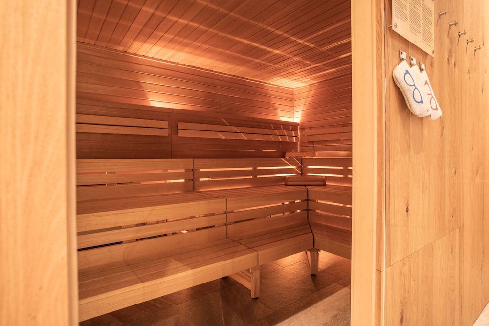 Schöner Spa-Bereich mit Sauna und kleinem Fitnessraum.