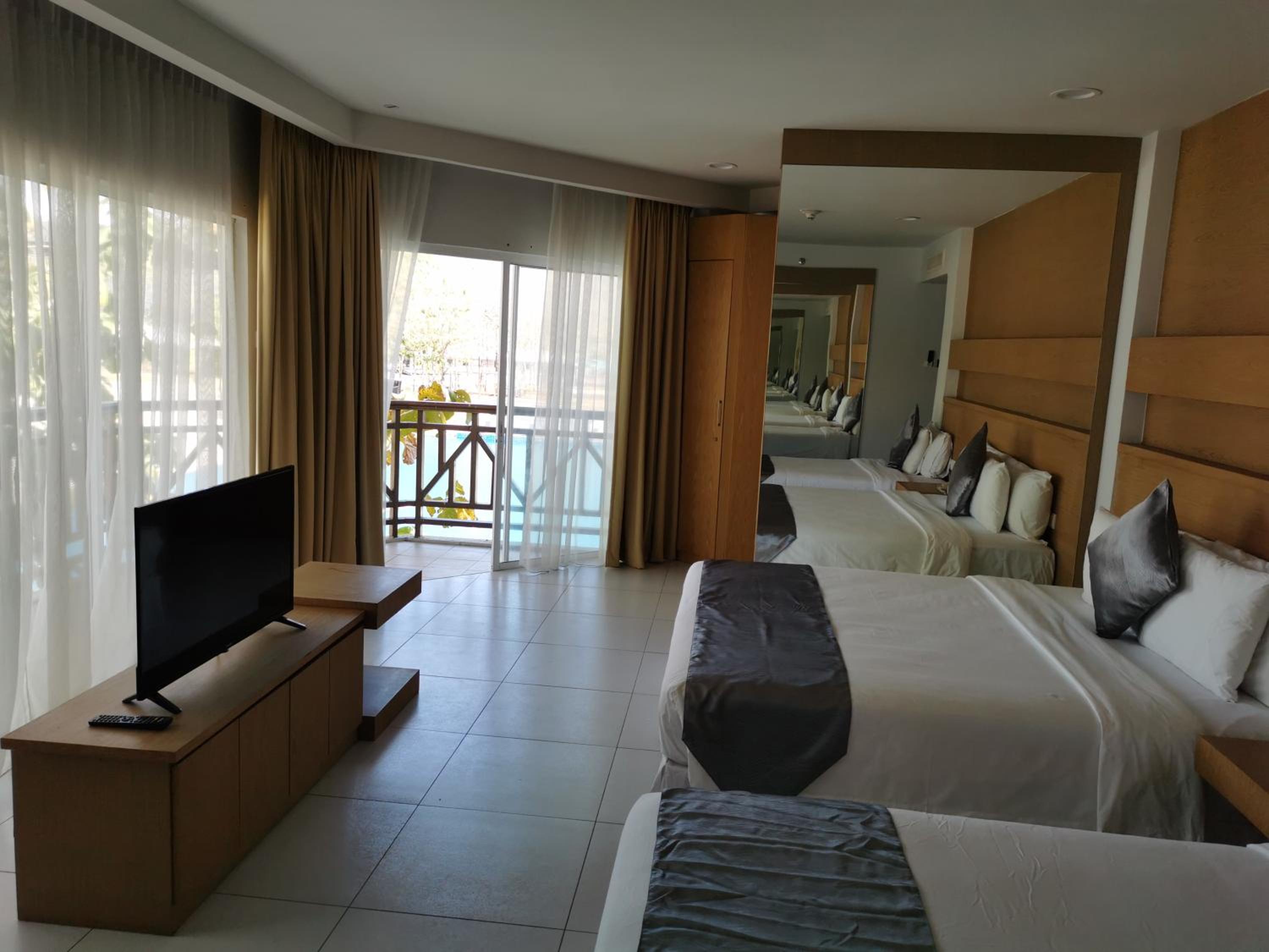 Room needs updating. Outdoor area, pool side, was tarmac - far too hot with little shade.