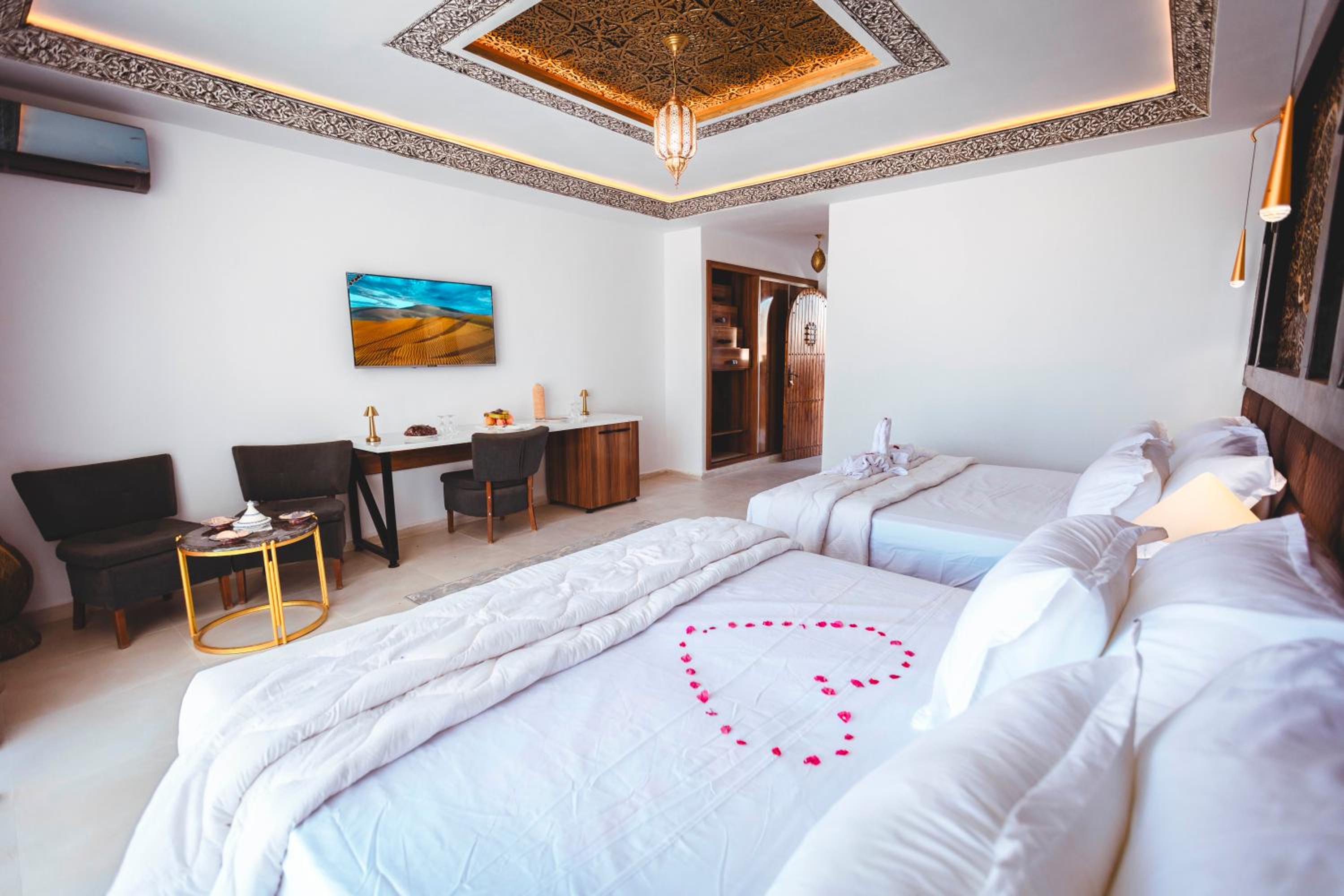 The room was excellently equipped, and the bathroom was spacious and beautifully designed. From the room, I enjoyed a stunning view of the Sahara dunes, which made the stay truly memorable. The property itself is wonderful, offering everything you need for the excursions that bring you to this area, while also providing the perfect setting for relaxation and indulgence. Whether you’re exploring during the day or simply enjoying a peaceful, luxurious rest on the premises, it’s a truly exceptional place to stay.