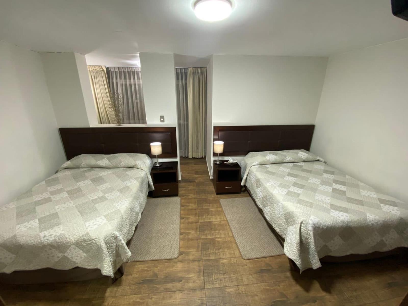 The spacious rooms at Arequipa Inn offer a cozy retreat with modern amenities such as LED cable TV, telephone, and private bathrooms with 24-hour hot water. The dark carpeted floors and cream walls create a soothing atmosphere for a relaxing stay.