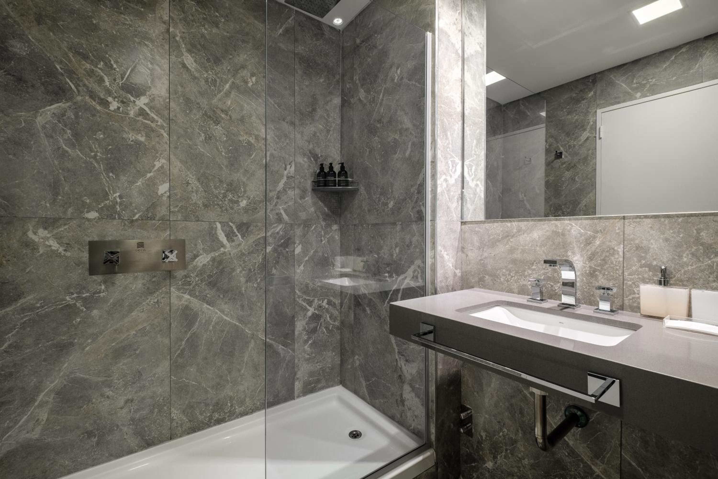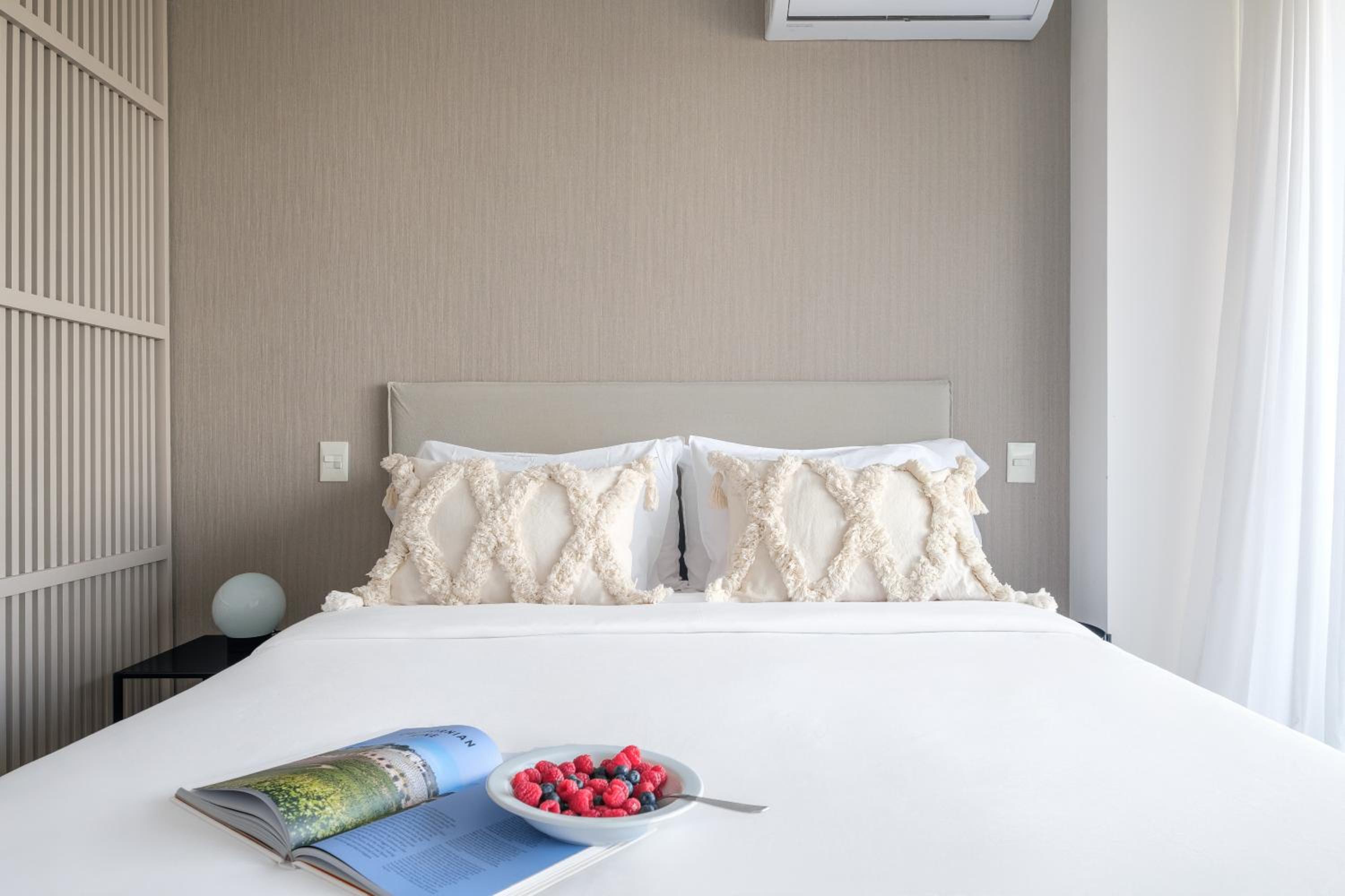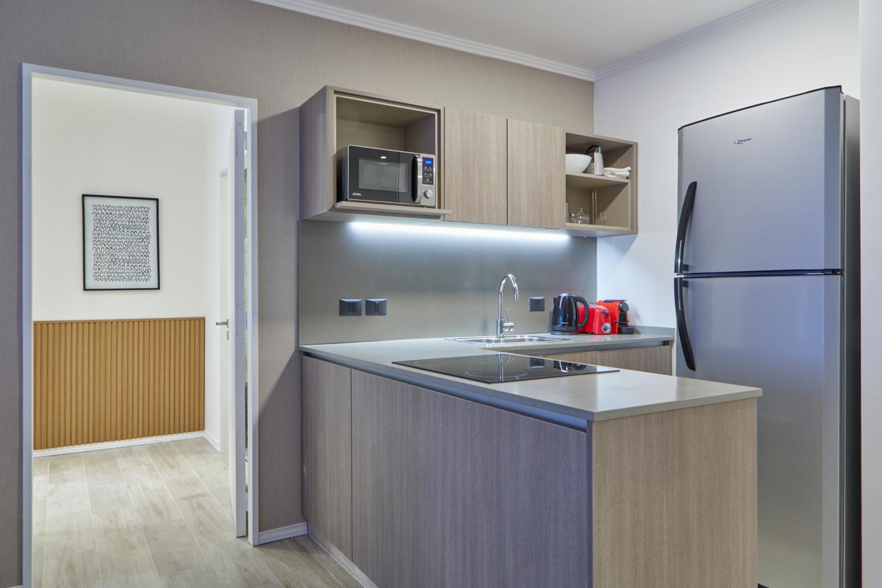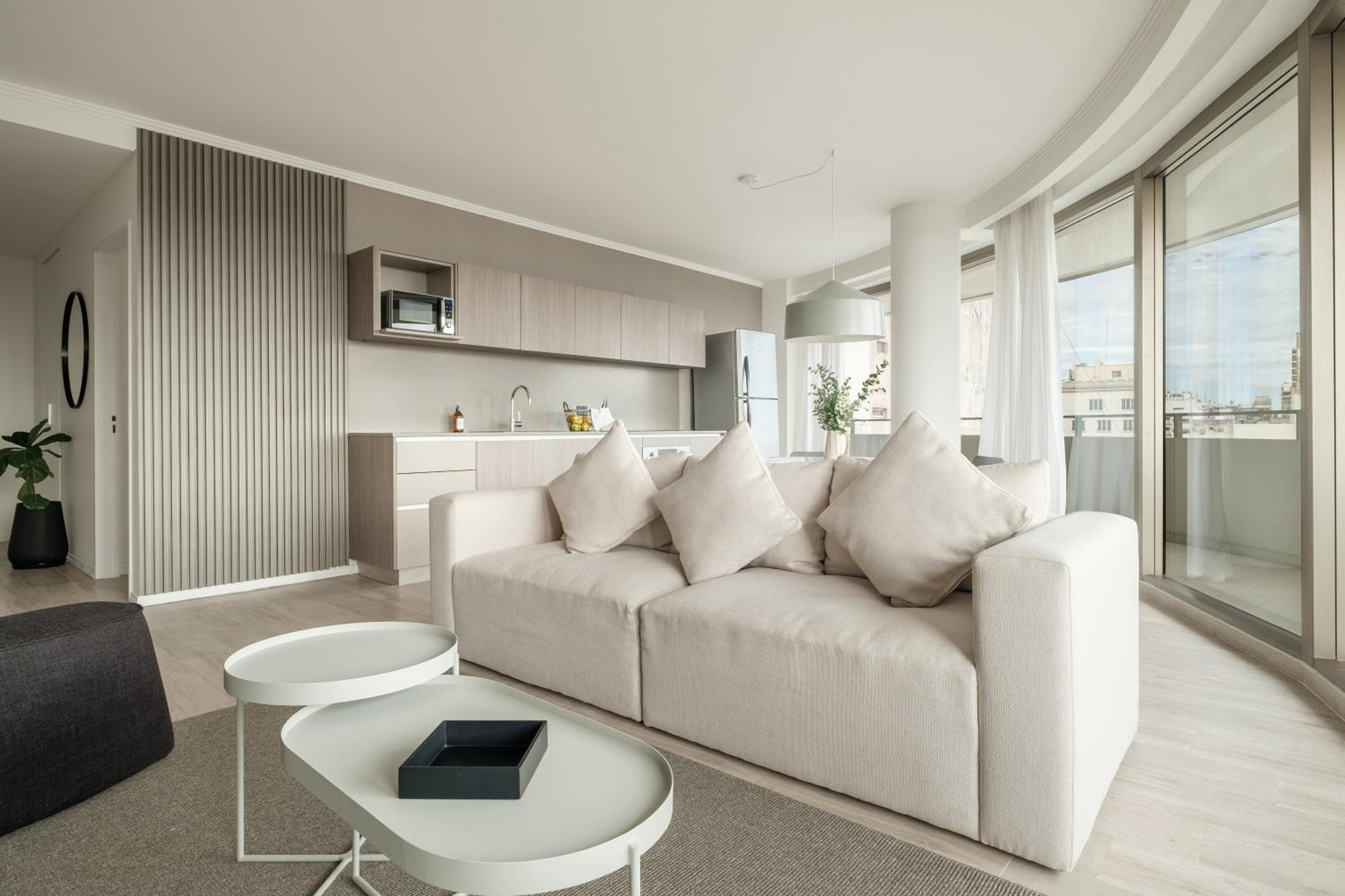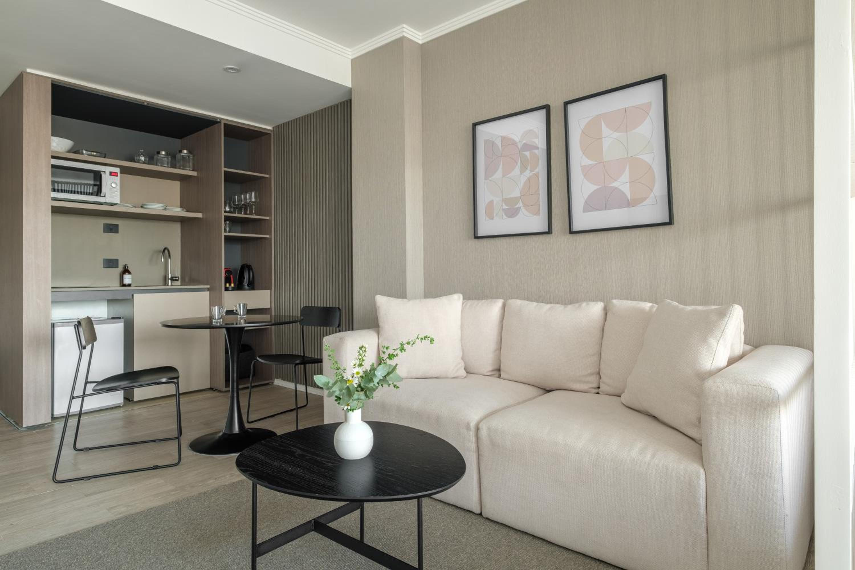 Each air-conditioned unit at the aparthotel is thoughtfully designed with modern amenities including a kitchen, flat-screen TV, and private bathroom.
