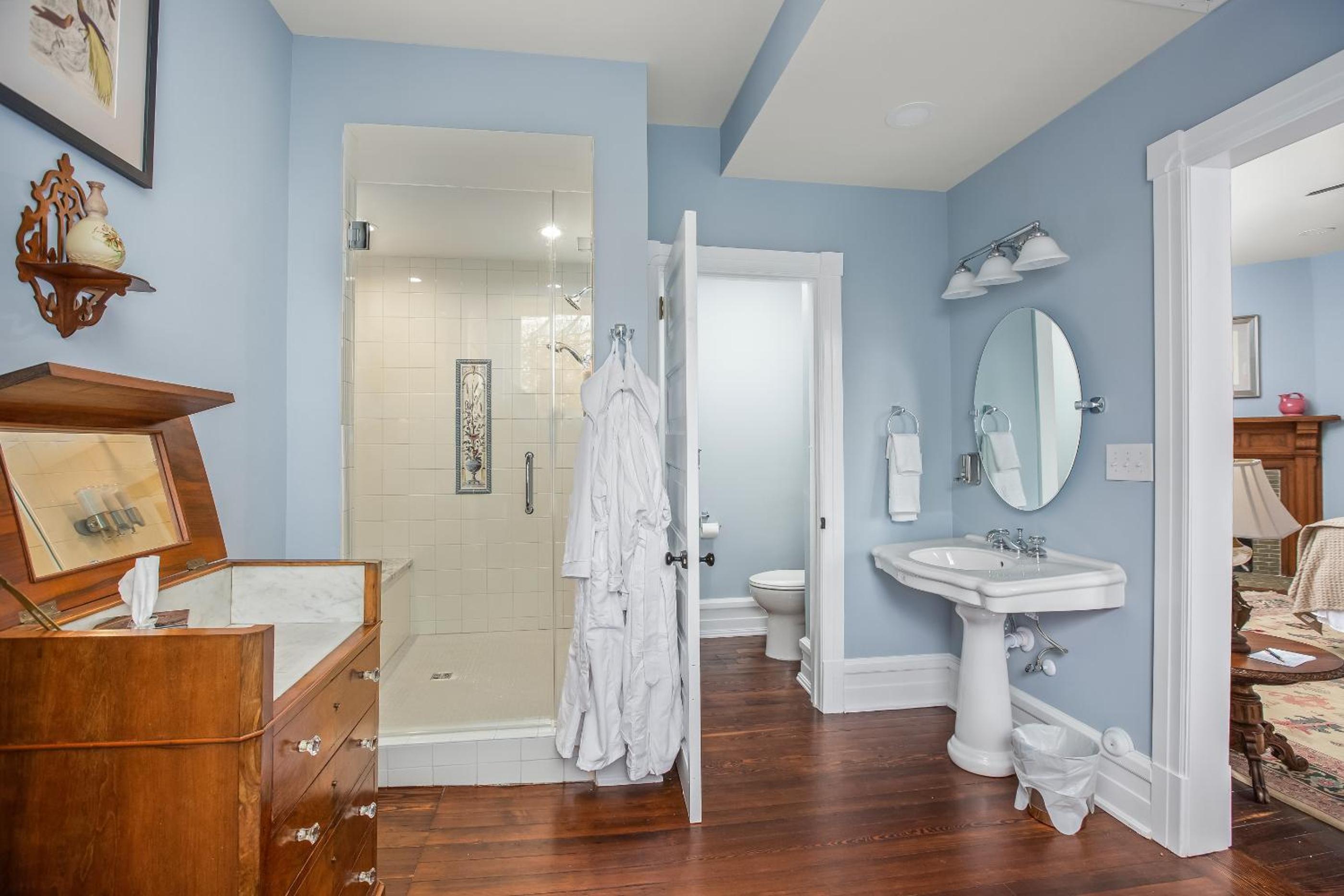 Super large bedroom with excellent bedding and pillows from "My Pillow". The bathroom was also very spacious with an oversized cast iron tub and an oversized shower. The service was wonderful and the hot breakfast was delicious! I highly recommend it!
