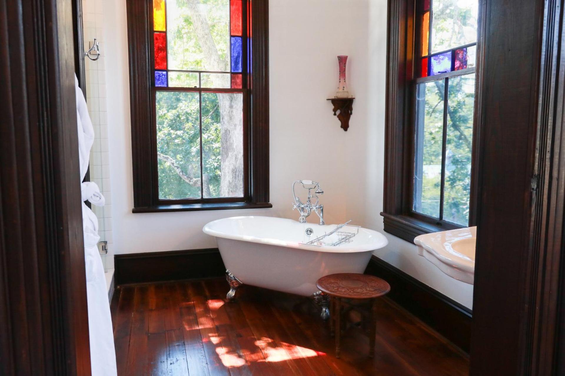 bathtub, furnishings (antiques), towels, complimentary adult beverage, breakfast, woodwork, bed and bedding