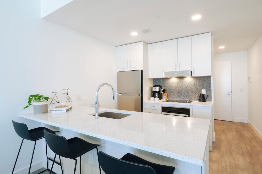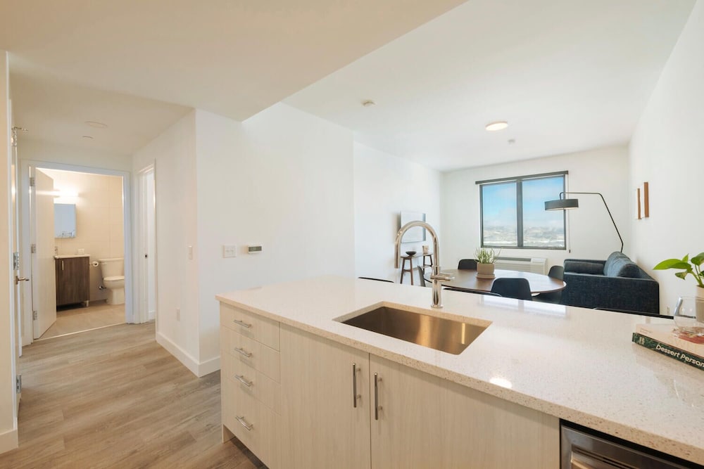 Really nice room, loved having a kitchen and sitting area. It was perfect for our vacation. It was clean and had pots/pans, utensils, bowls, plates, glasses etc. Close to the freeway so a little bit of background traffic noise, black out shades were great!