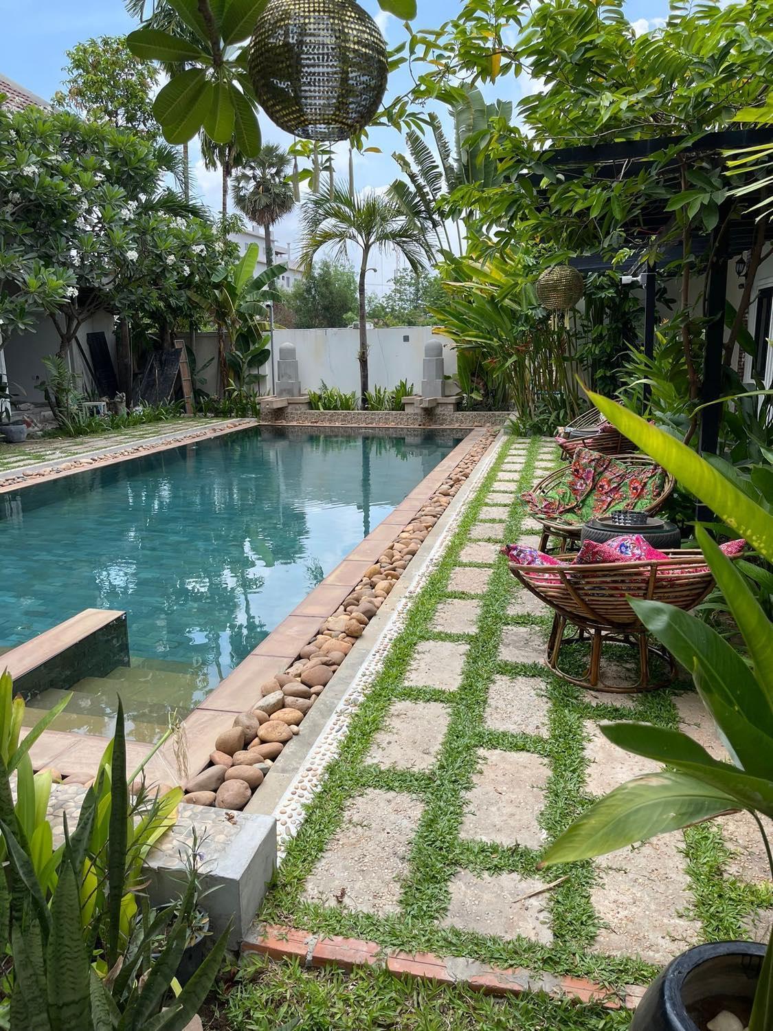 It had this lovely garden that made us feel so much like we were in the middle of the tropical jungle with a swimming pool. We also noticed all of the mango trees and enjoyed some beautiful breakfast made by the property owners. It was really adelightful stay.