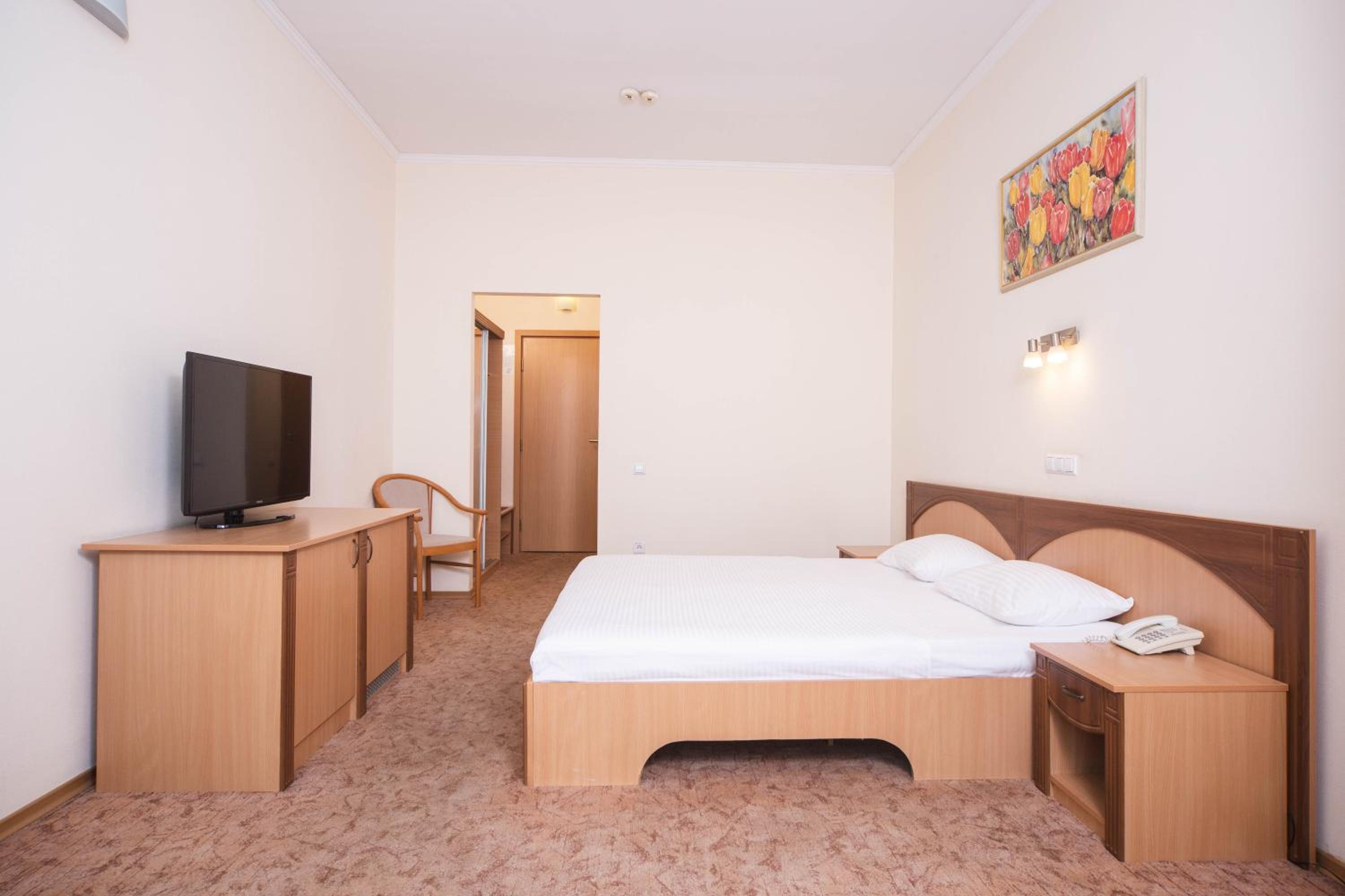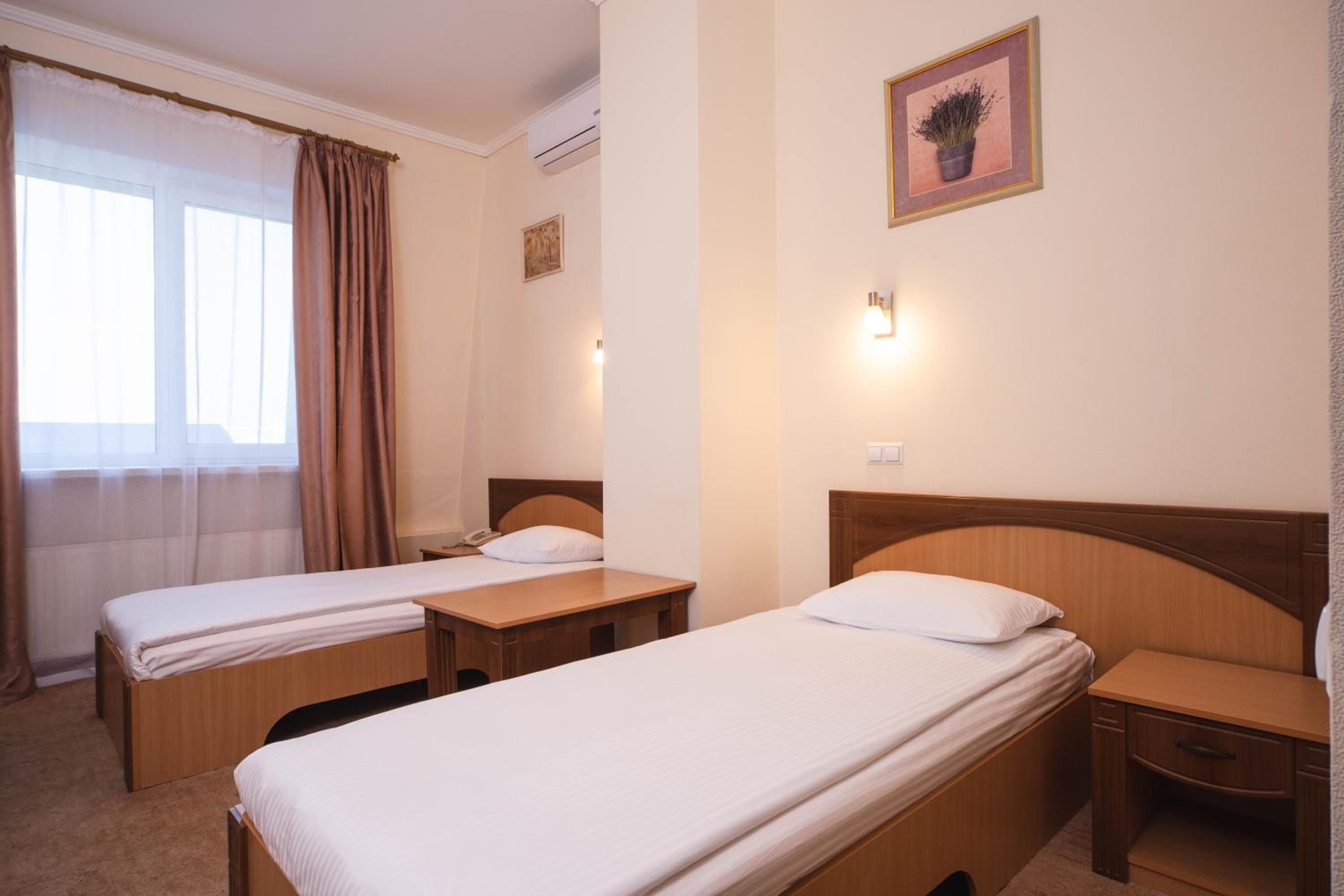 The air-conditioned rooms at Panteleymonovskaya Hotel are designed for both comfort and productivity, featuring amenities such as Cable TV, a work desk, and a private bathroom. The bright and airy rooms with large windows provide a soothing retreat with a neutral color palette.