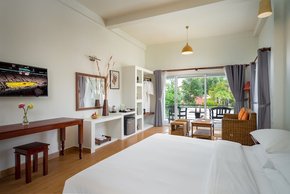 A short ride from the busy Pub Street and riverside area. Near the Angkor National Museum. Comfy, friendly with good onsote dining options.
