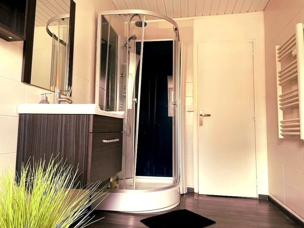 L’appart’ est très spacieux et très bien équipé avec douche baignoire balnéo et sauna du haut de gamme Apéritif à l’arrivée, machine à café, Pour le petit déjeuner baguette et pain au chocolat frais livré devant la porte dans le frigo Orange a presser beurre confitures