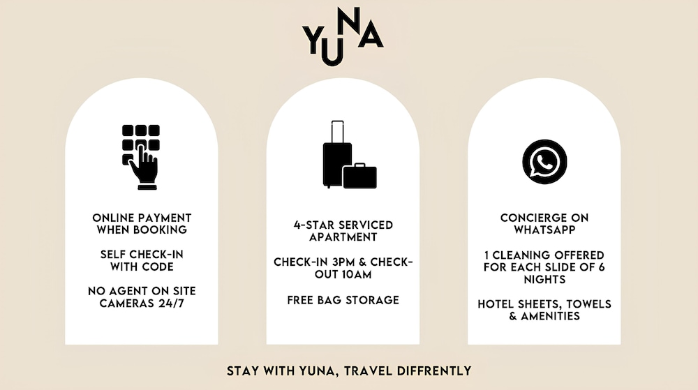 We had a wonderful stay at Yuna Apart Hotel. Everything was spotlessly clean, the bed was very comfortable, and the apartment had everything we needed. We stayed in the one bedroom apartment, which was super practical, and the location was excellent just a 15–20 minute walk to the Arc de Triomphe.
