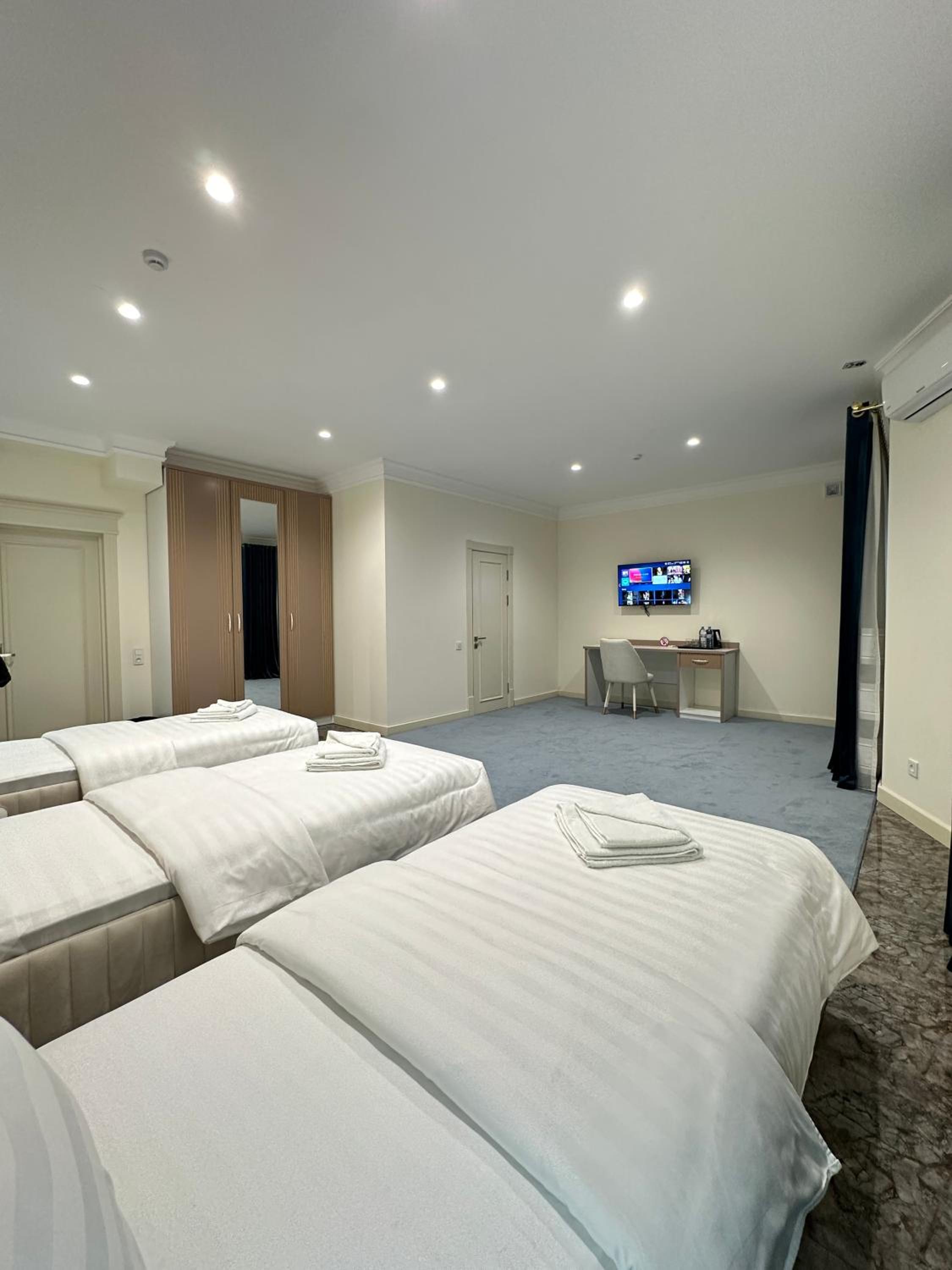 Nur Makon Hotel in Tashkent offers elegant rooms with modern amenities like air conditioning, flat-screen TVs, and comfortable bedding. Some rooms even feature a private balcony for a scenic view.