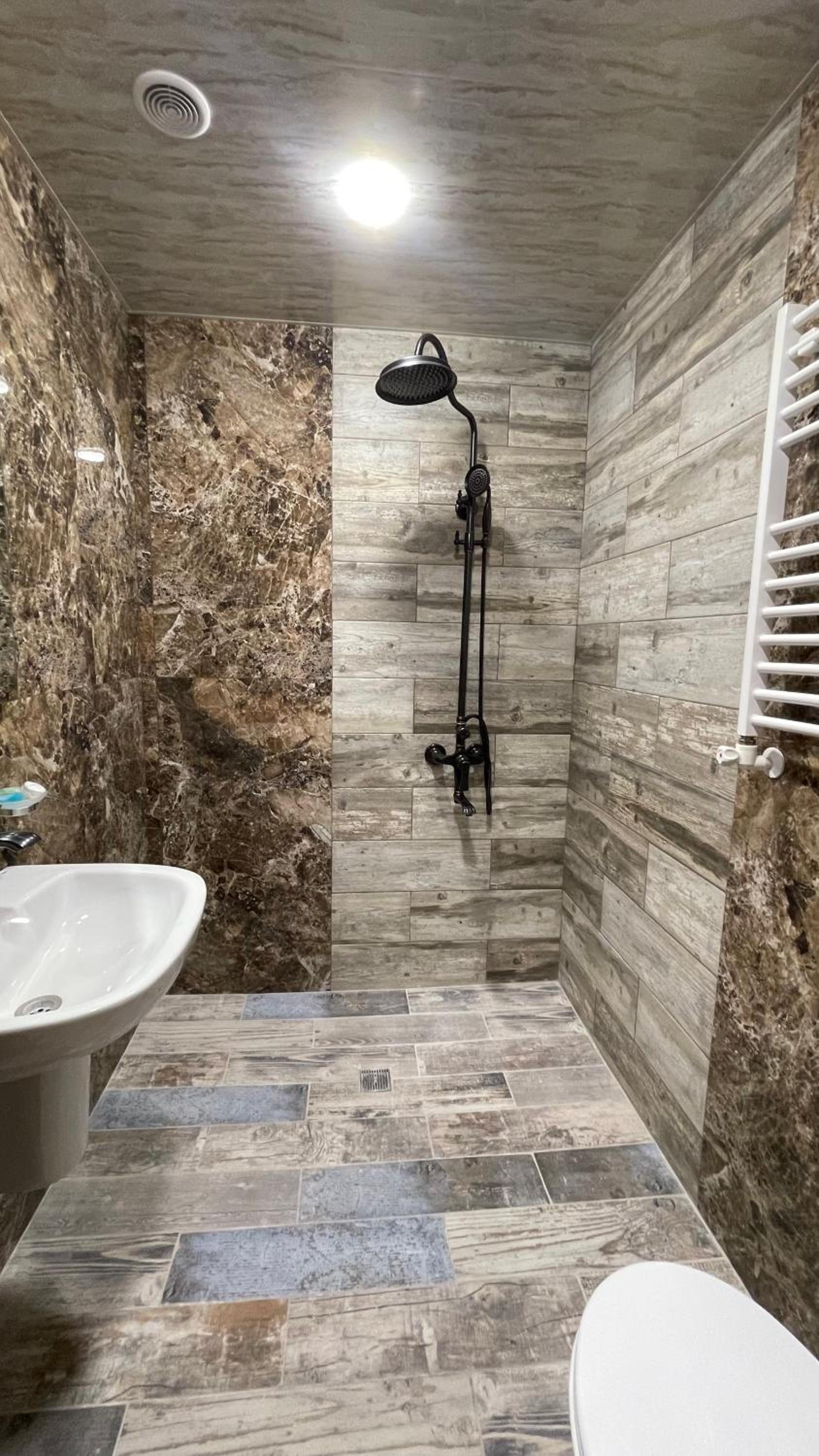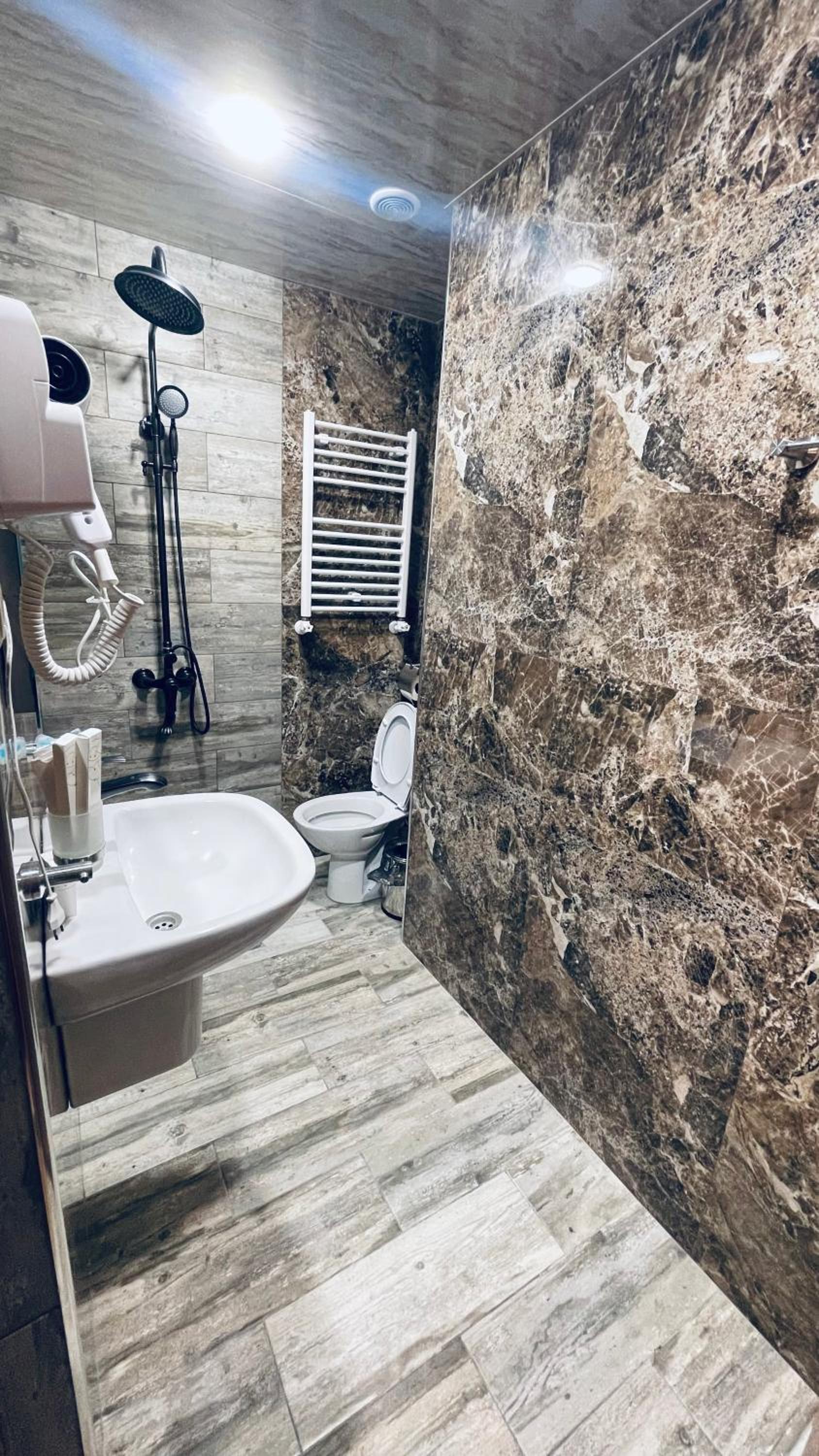 3. Душ в туалете заливает весь пол и вода разливается по всей поверхности, пришлось класть полотенце, что бы как-то потом ходить в туалет не по мокрому полу. Нужна шторка.
