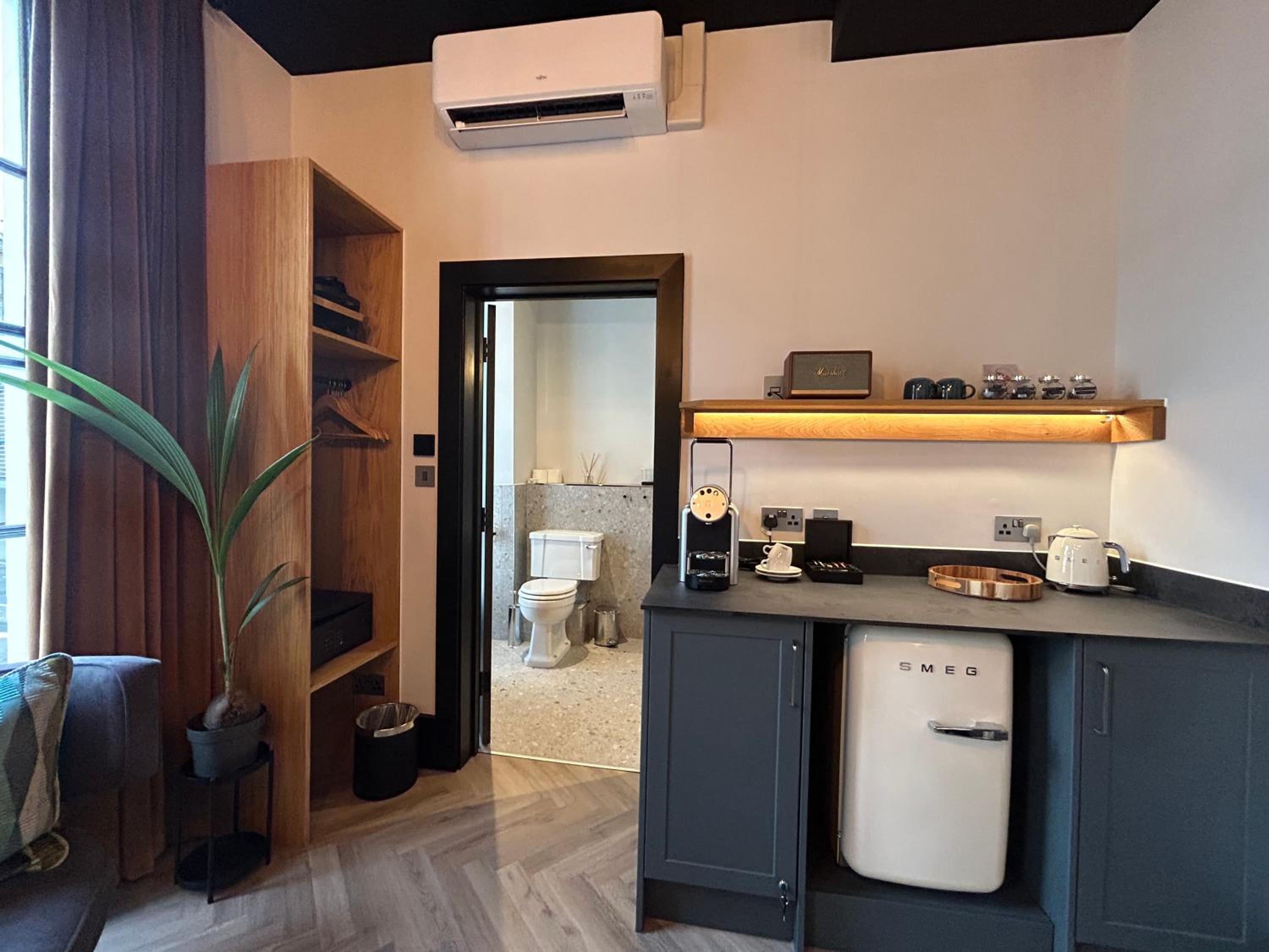 Indulge in our air-conditioned units equipped with modern amenities and stunning city views. Each unit features a comfortable workspace, a coffee machine, and a fully stocked kitchenette for your convenience.