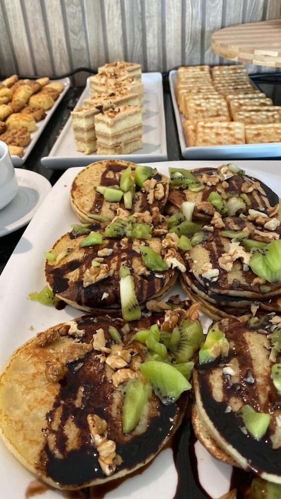 The rooms are nice and well appointed. However parking is very difficult and inconvenient. Hot water and internet aren’t consistent. We were traveling with 4 kids and they couldn’t get the television to work. Breakfast was good. Room is a nice size.