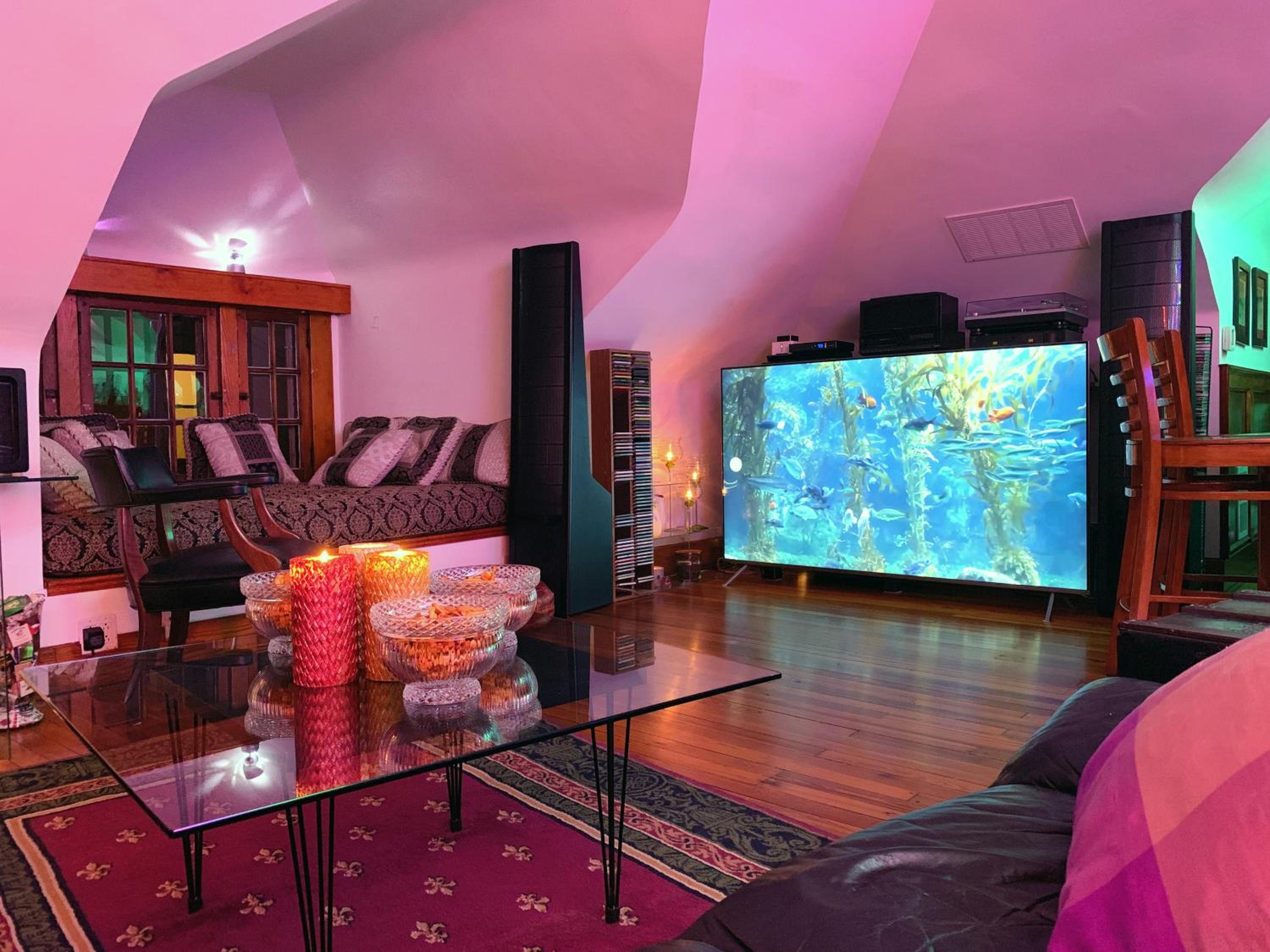 Friendly, gave a tour as soon as we arrived and you can check in at noon! The house is beautiful, the top floor bar area was a big surprise. Then of course being able to use the hot tub out in the snow at anytime, the massagers on those jets and my back, we didn’t want to get out. The conversation was great, there was Information provided that showed everything near by. The park across the street was a nice reprieve and very peaceful.