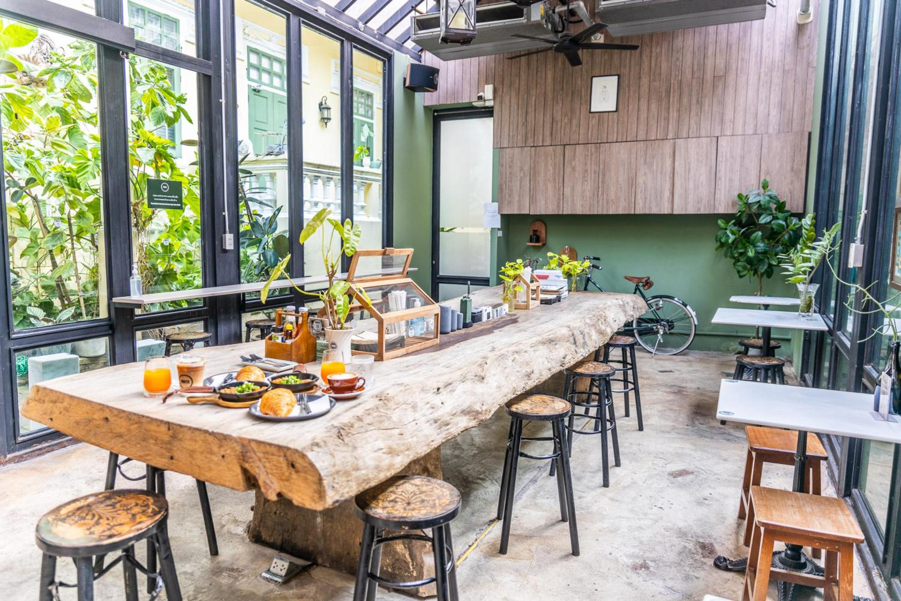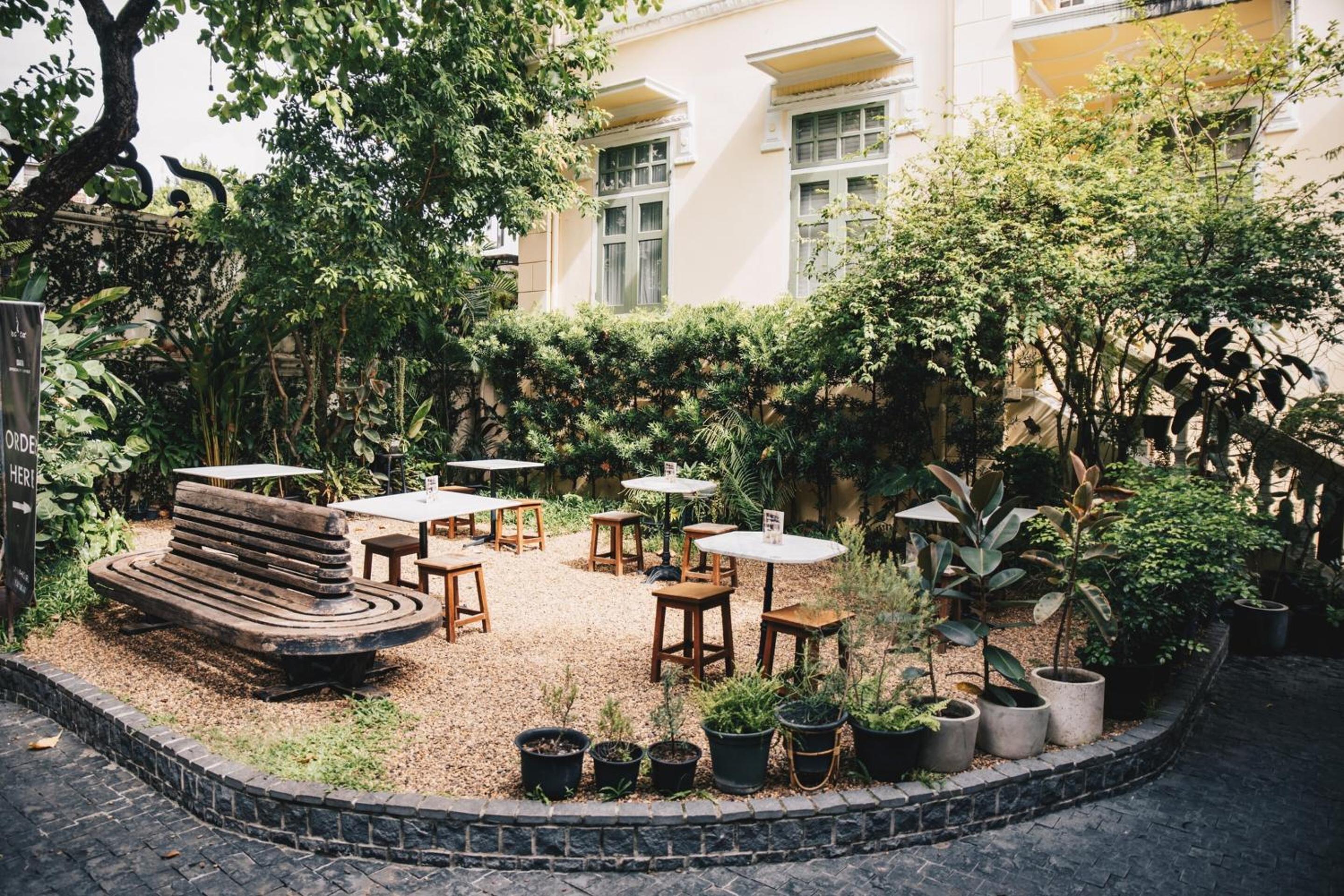 Escape the hustle and bustle of the city at Baan 2459's serene garden and terrace. Perfect for unwinding after a day of exploring Bangkok, guests can relax in this peaceful oasis and enjoy the beautiful surroundings.
