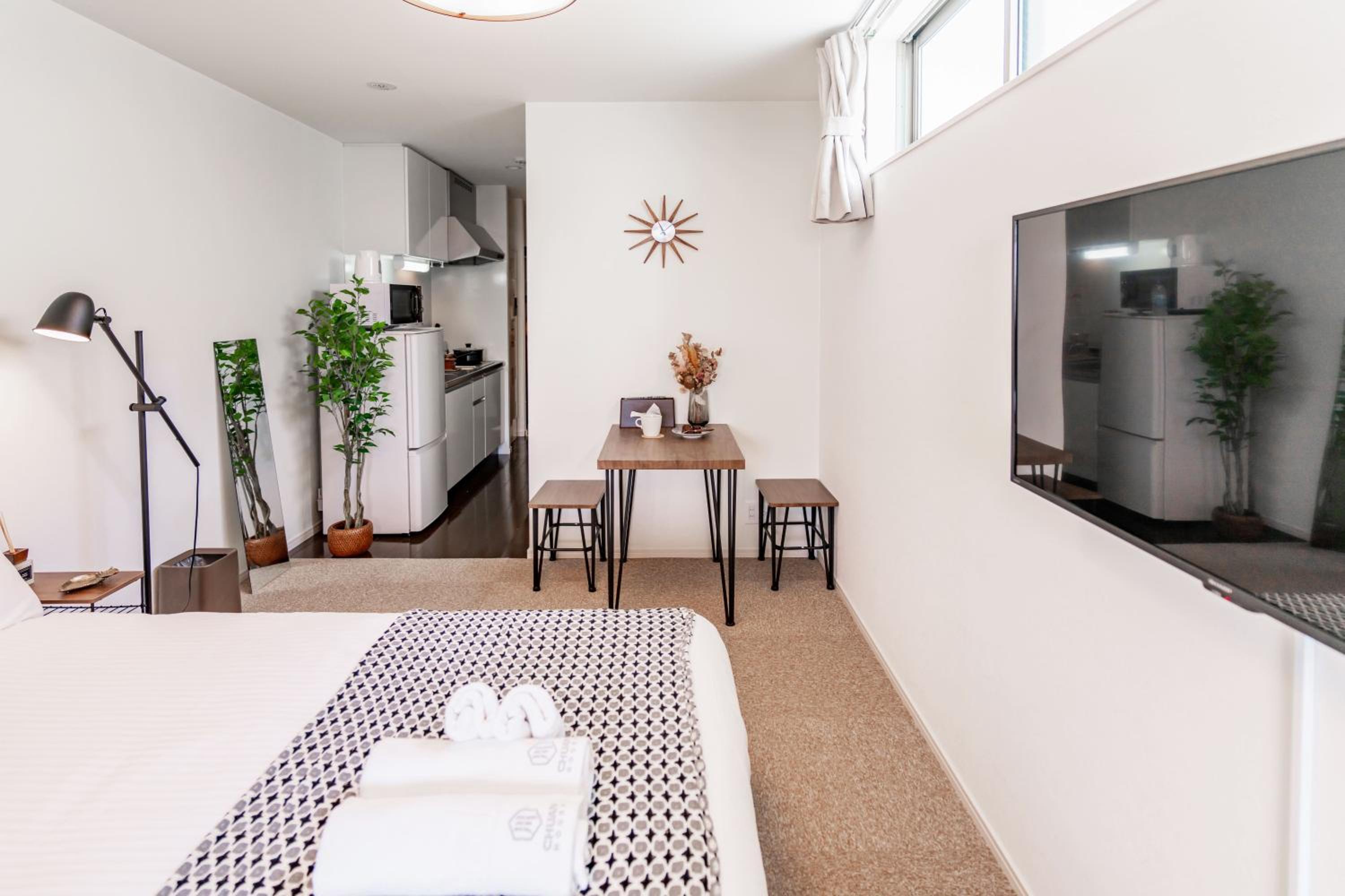 Air conditioning really struggled to cool apartment in a hot Japanese summer. The kitchen area is very narrow. Only seating for 2 in spite of having beds for 4. Eating dinner on bed not ideal. Just needed 2 extra stools 😊