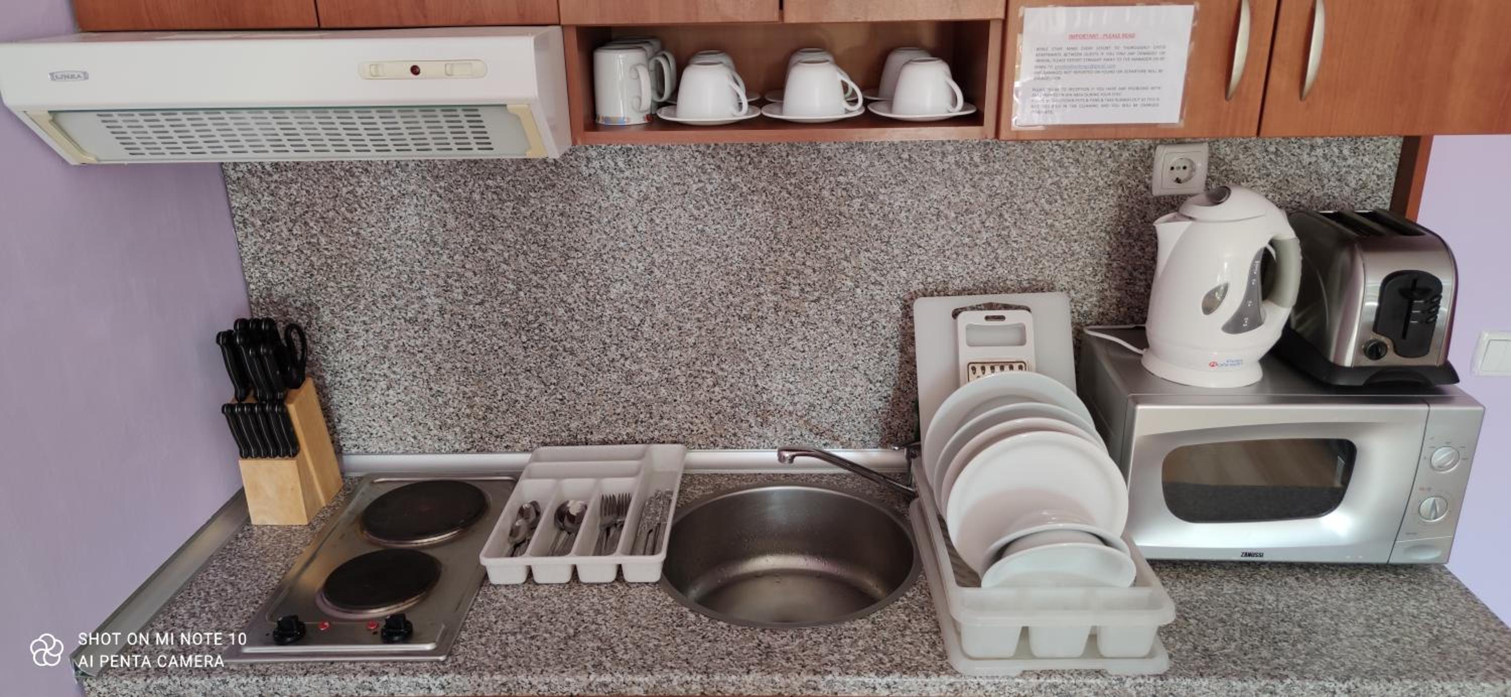 The kitchen facilities (aspirator, stovetop, refrigerator, and microwave) were old and damaged but still functional. The light of the aspirator above the stovetop wasn't working, and the sink had poor drainage.