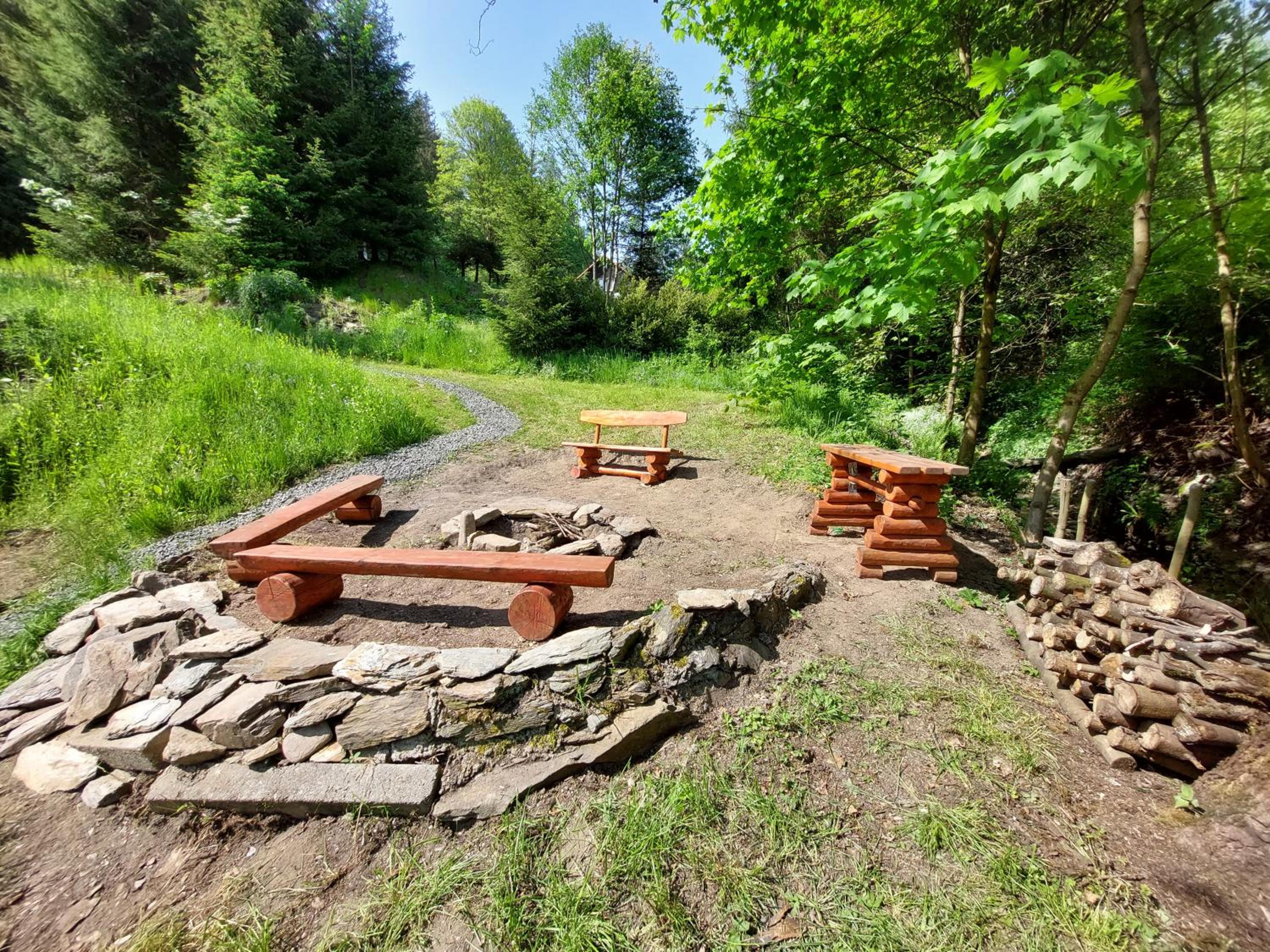 Experience convenience with a fully equipped kitchen, complete with a microwave and dining area. Unwind by the outdoor fireplace and enjoy a cozy evening under the stars.