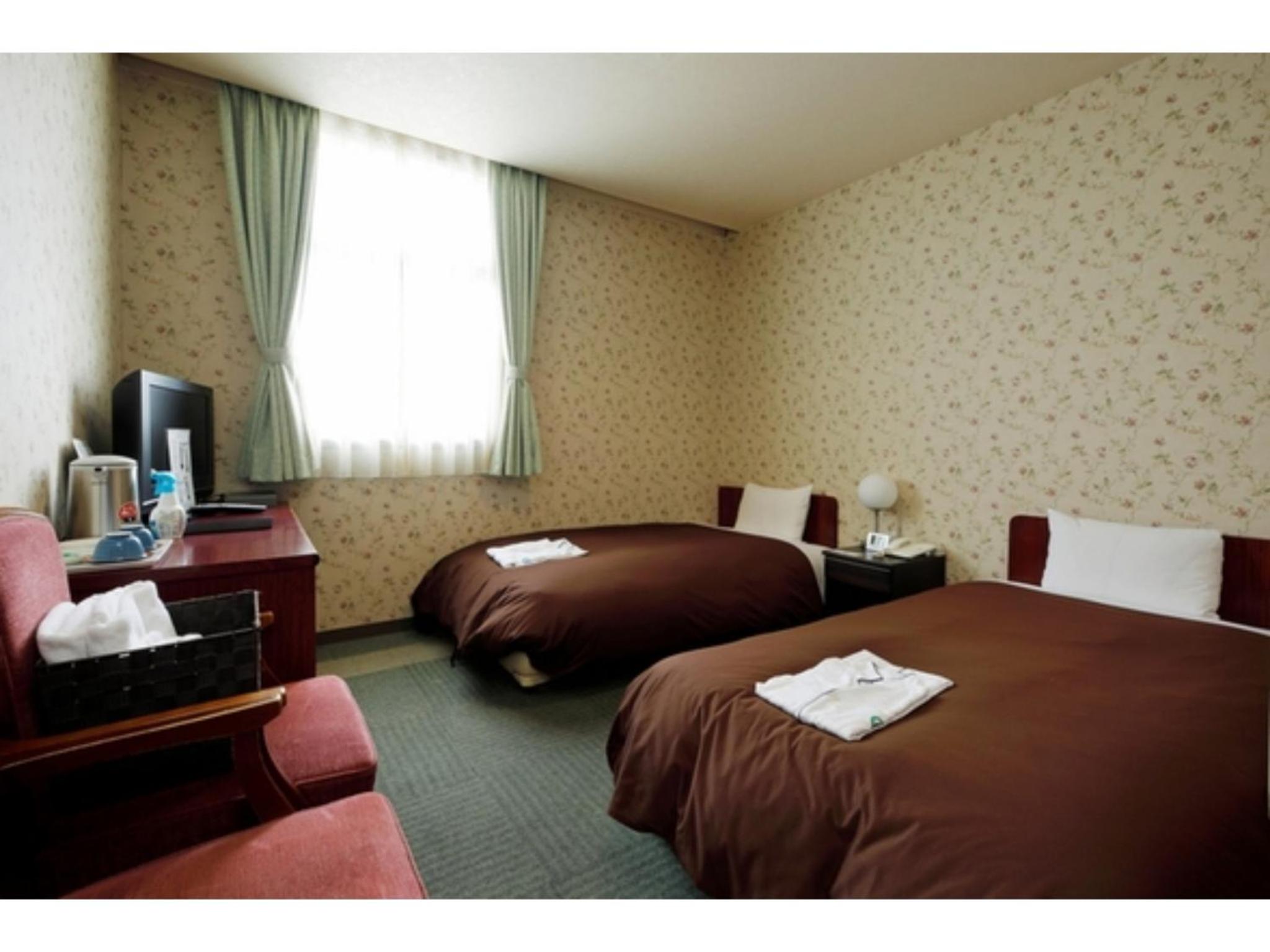 Guest rooms feature modern amenities such as a TV, private bathroom, and air conditioning for a relaxing stay.