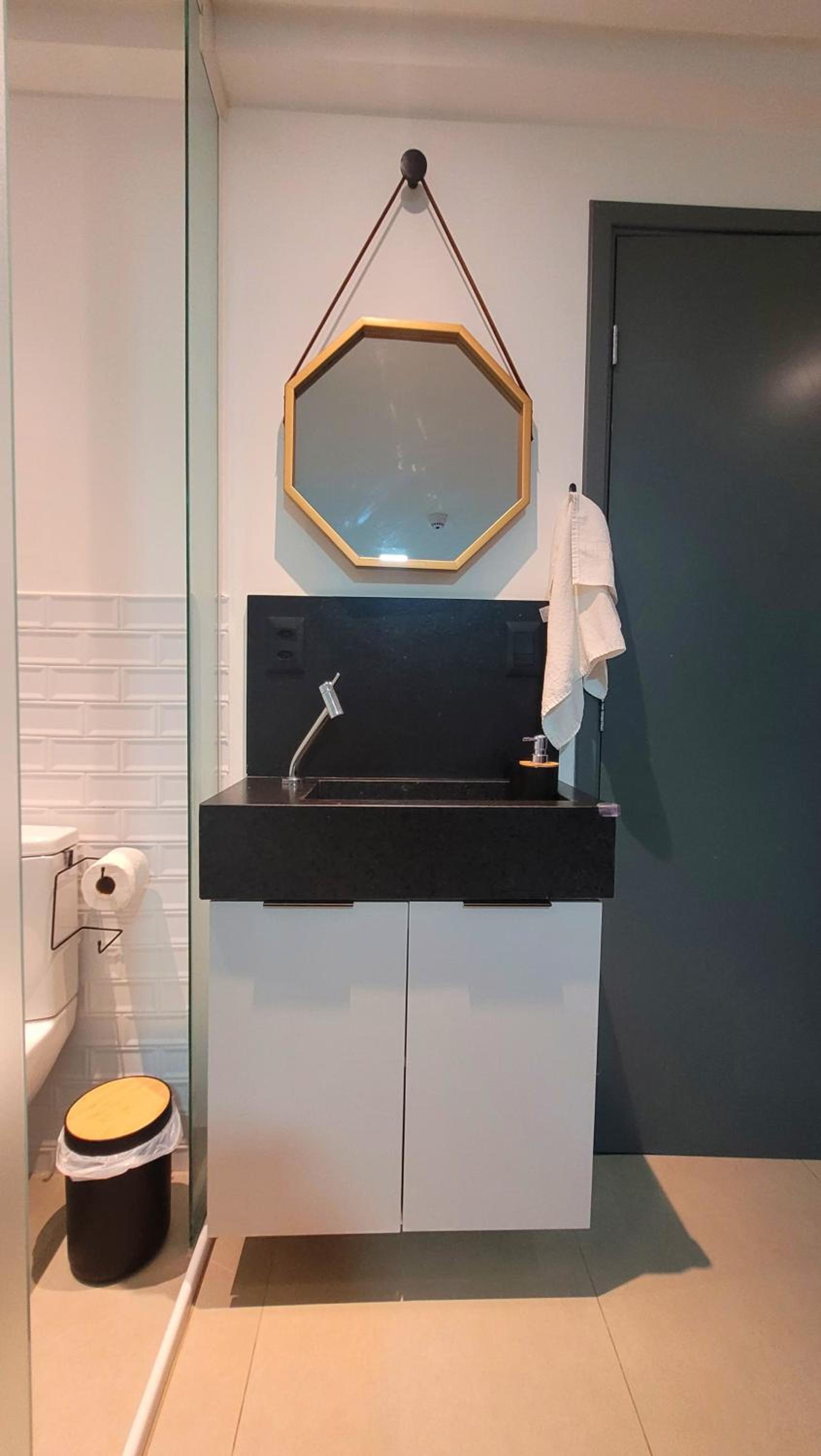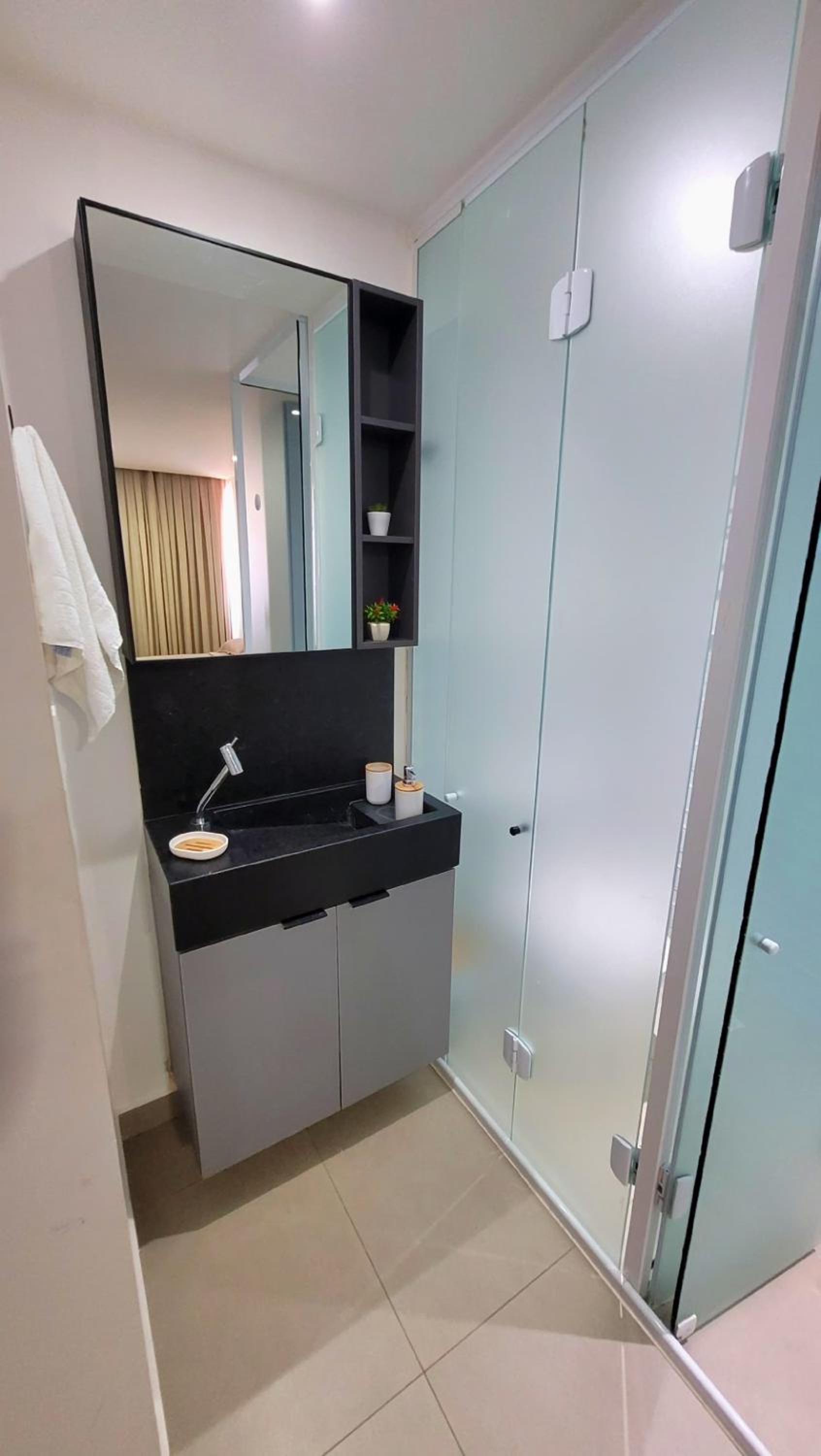 O banheiro é um pouco apertado, mas nada que atrapalhe.