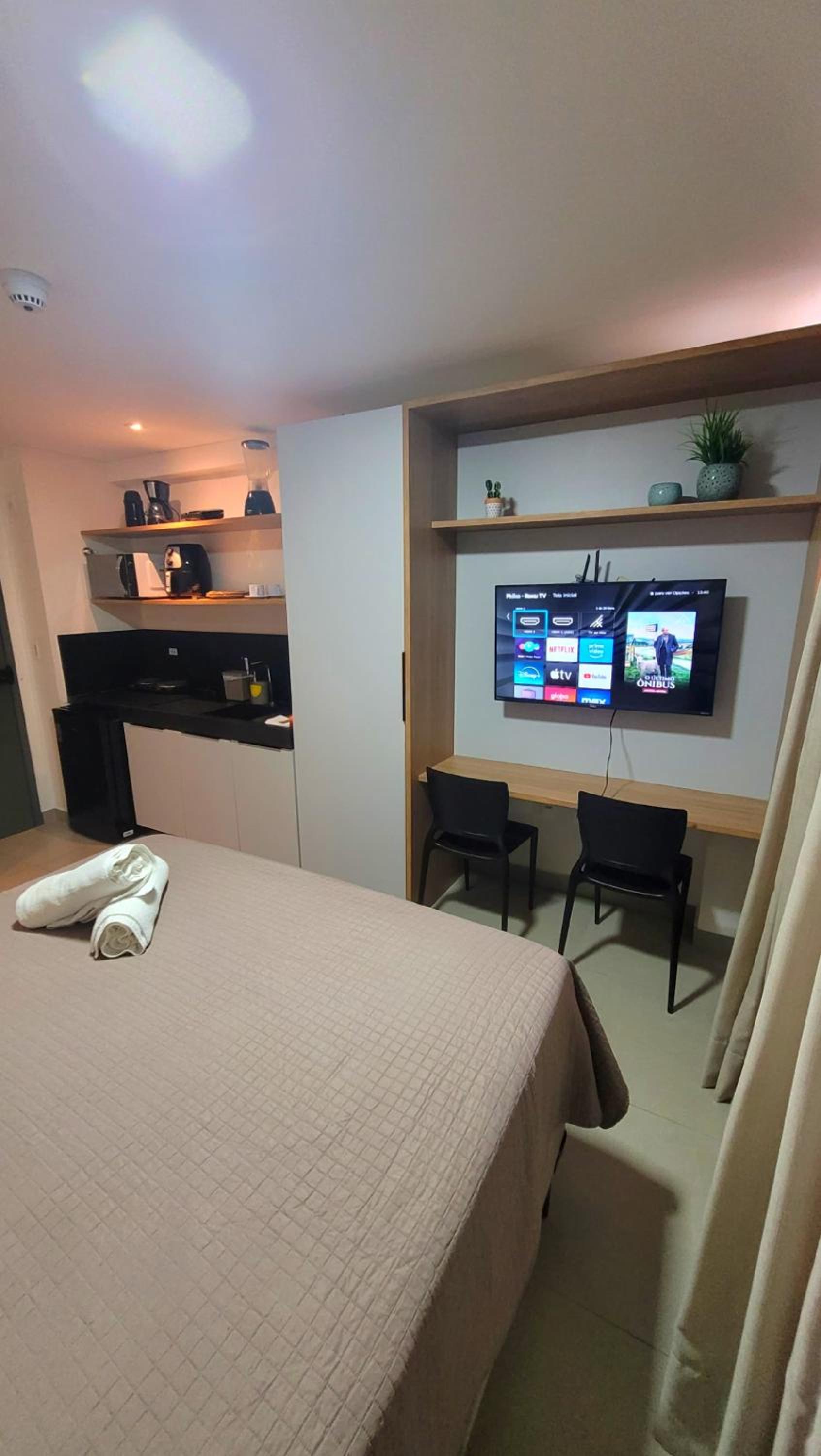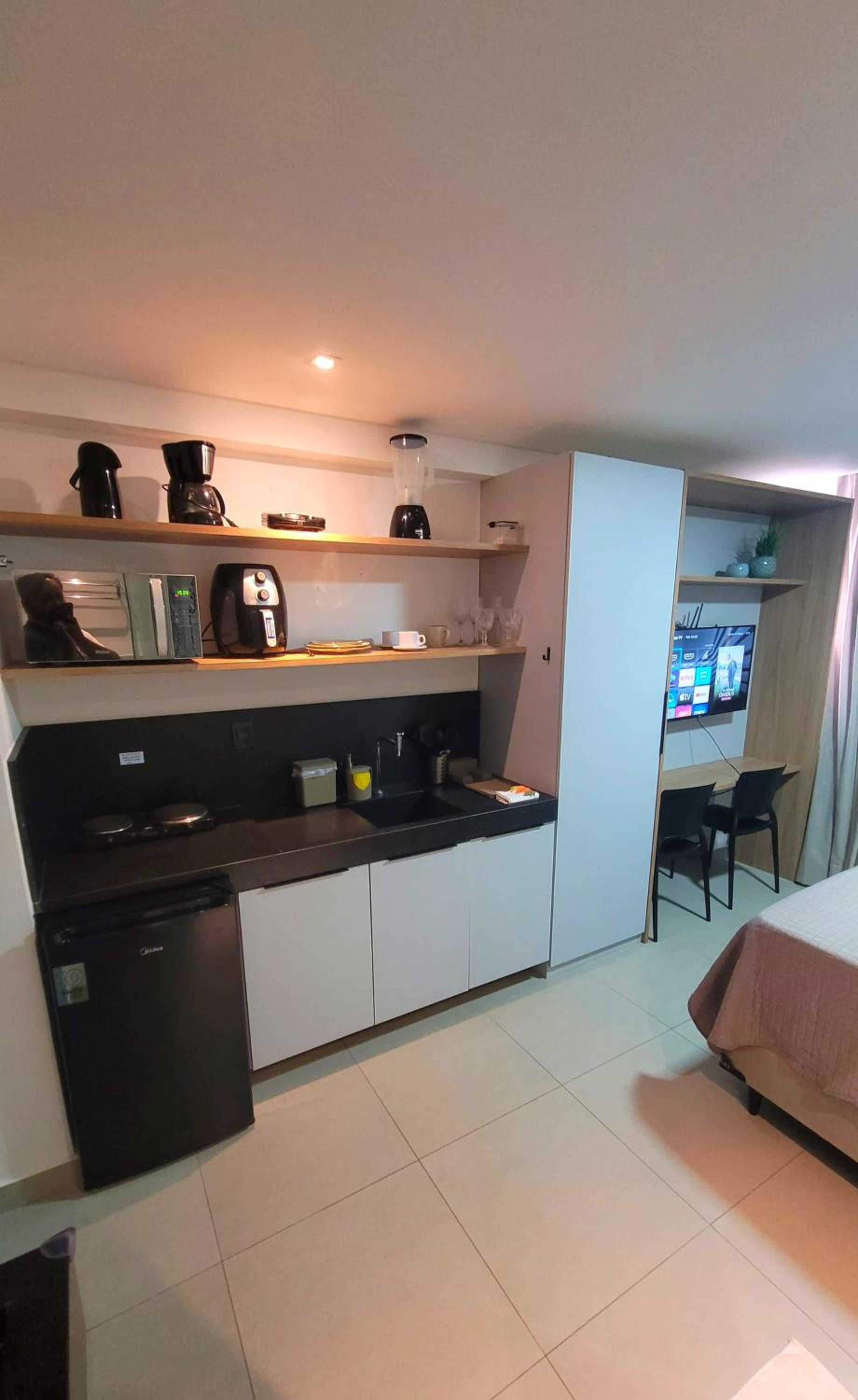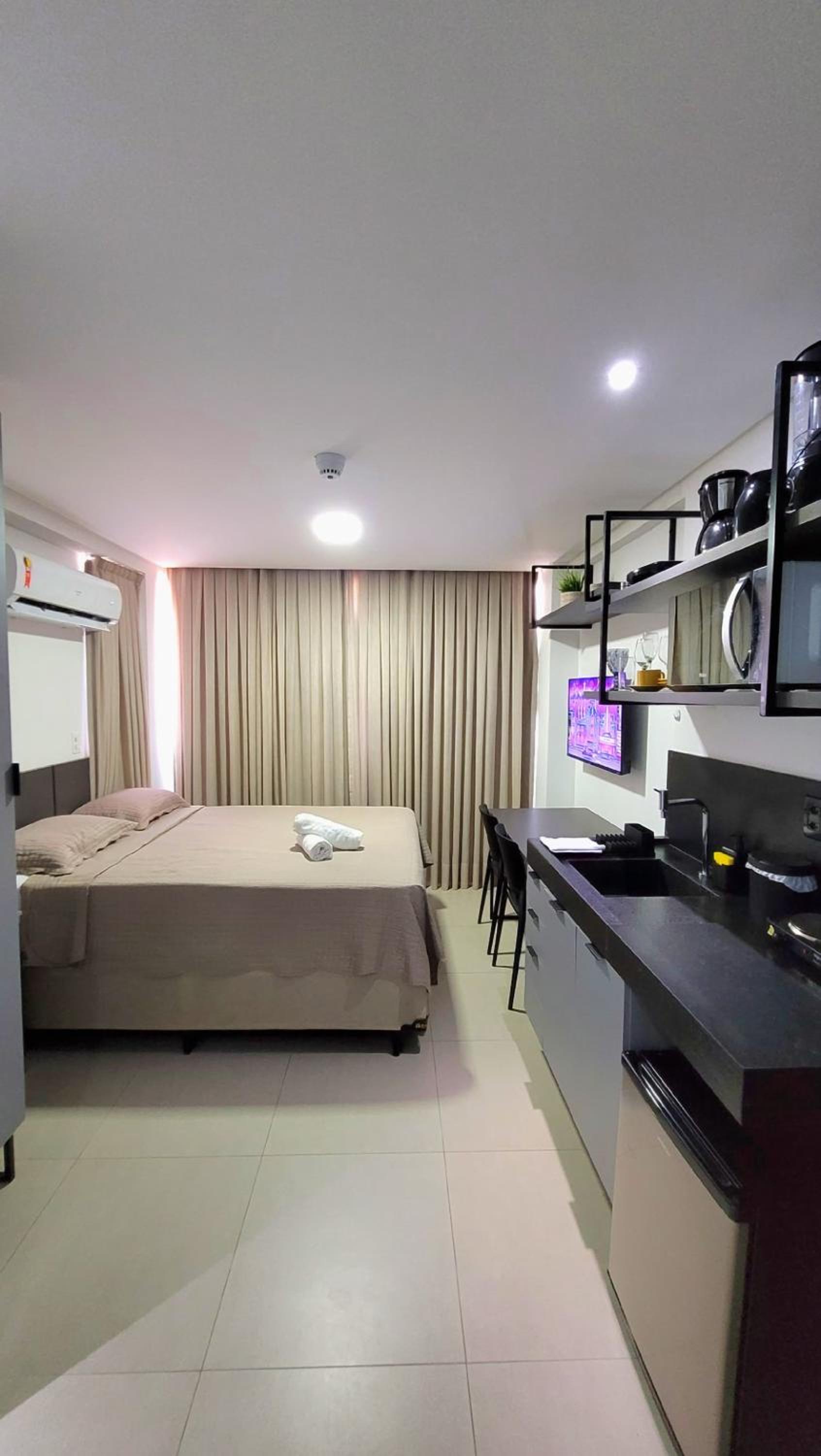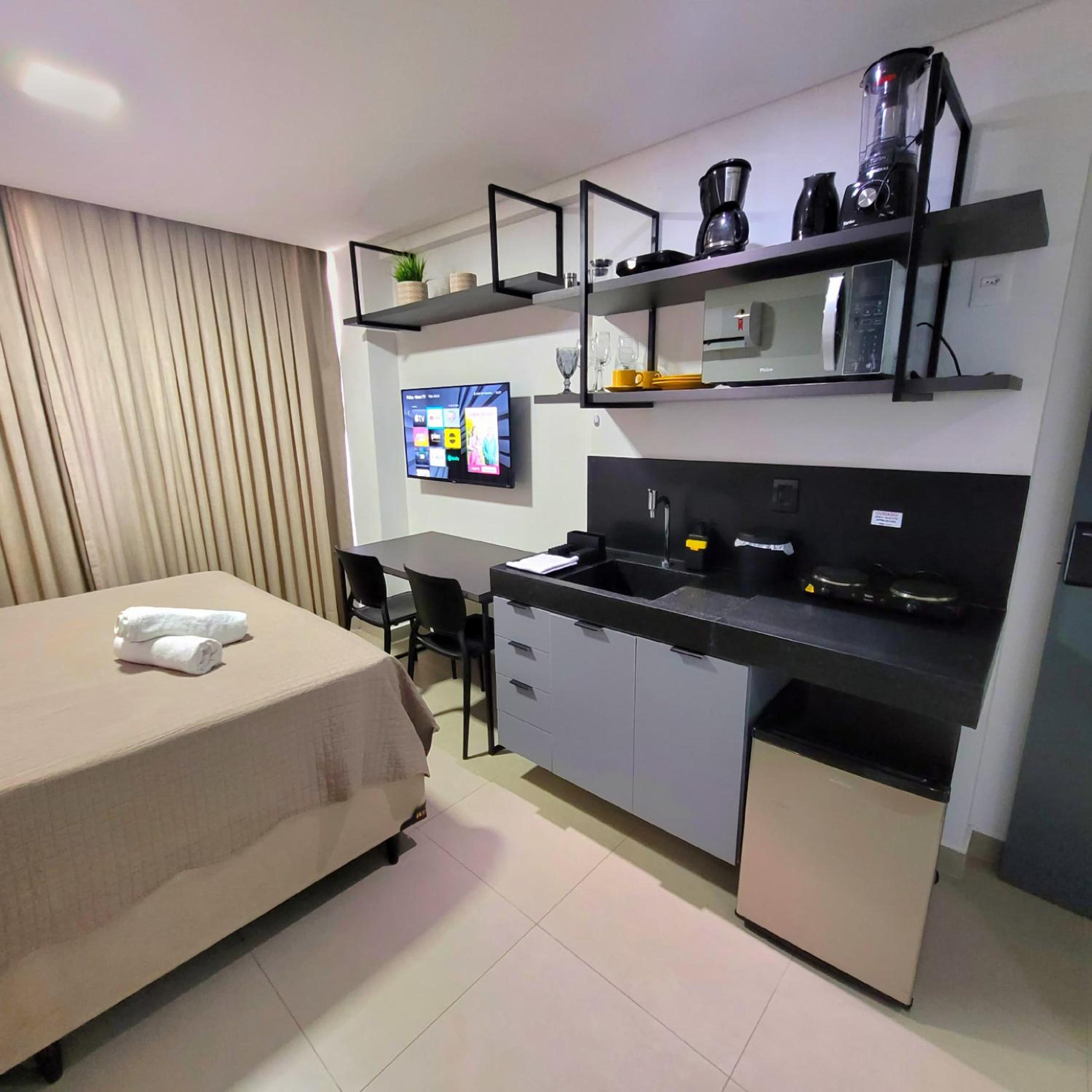 Apartamento novo, muito organizado, bastante utensílios na cozinha, atendimento ótimo, tem cafeteria na recepção