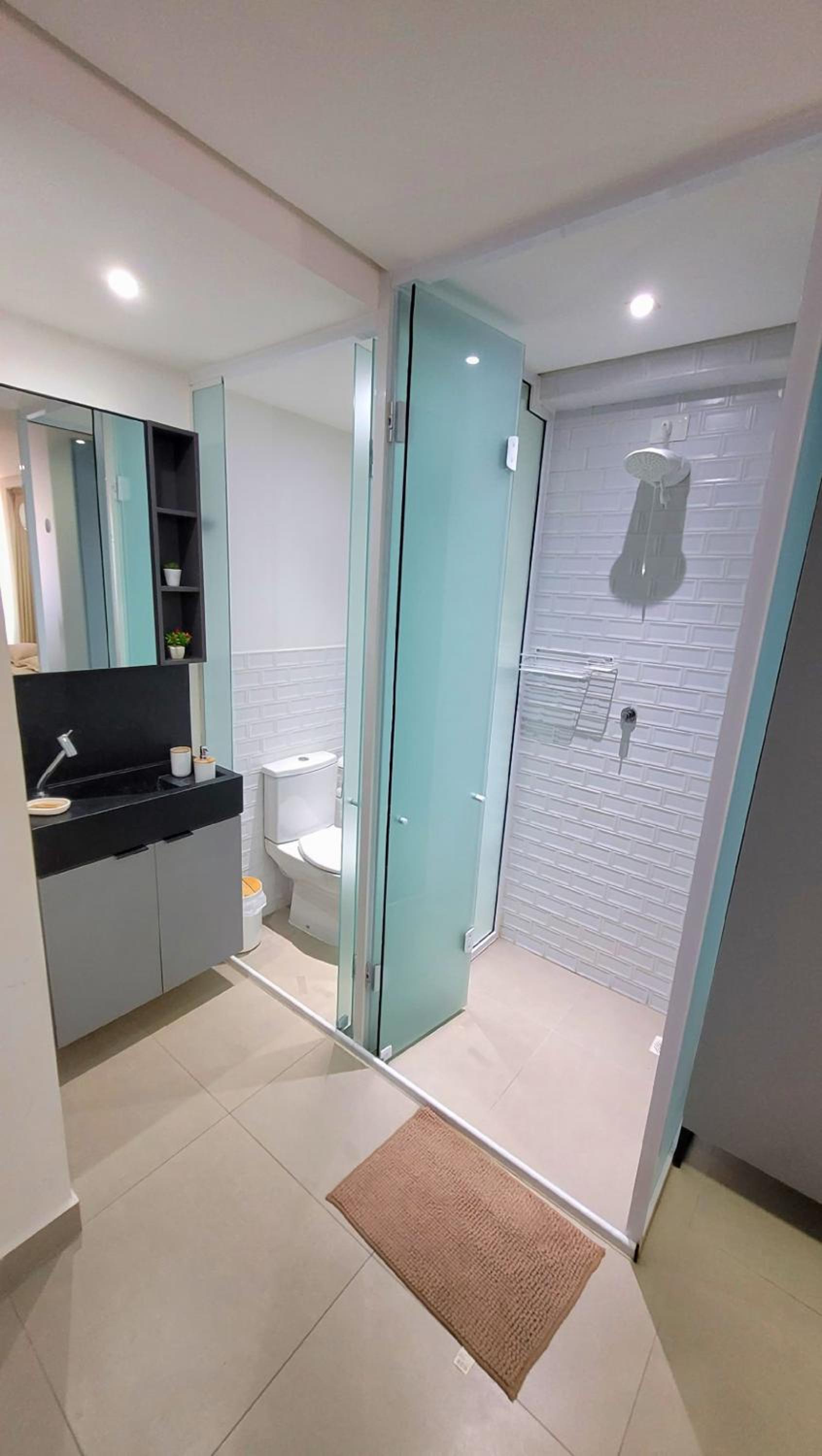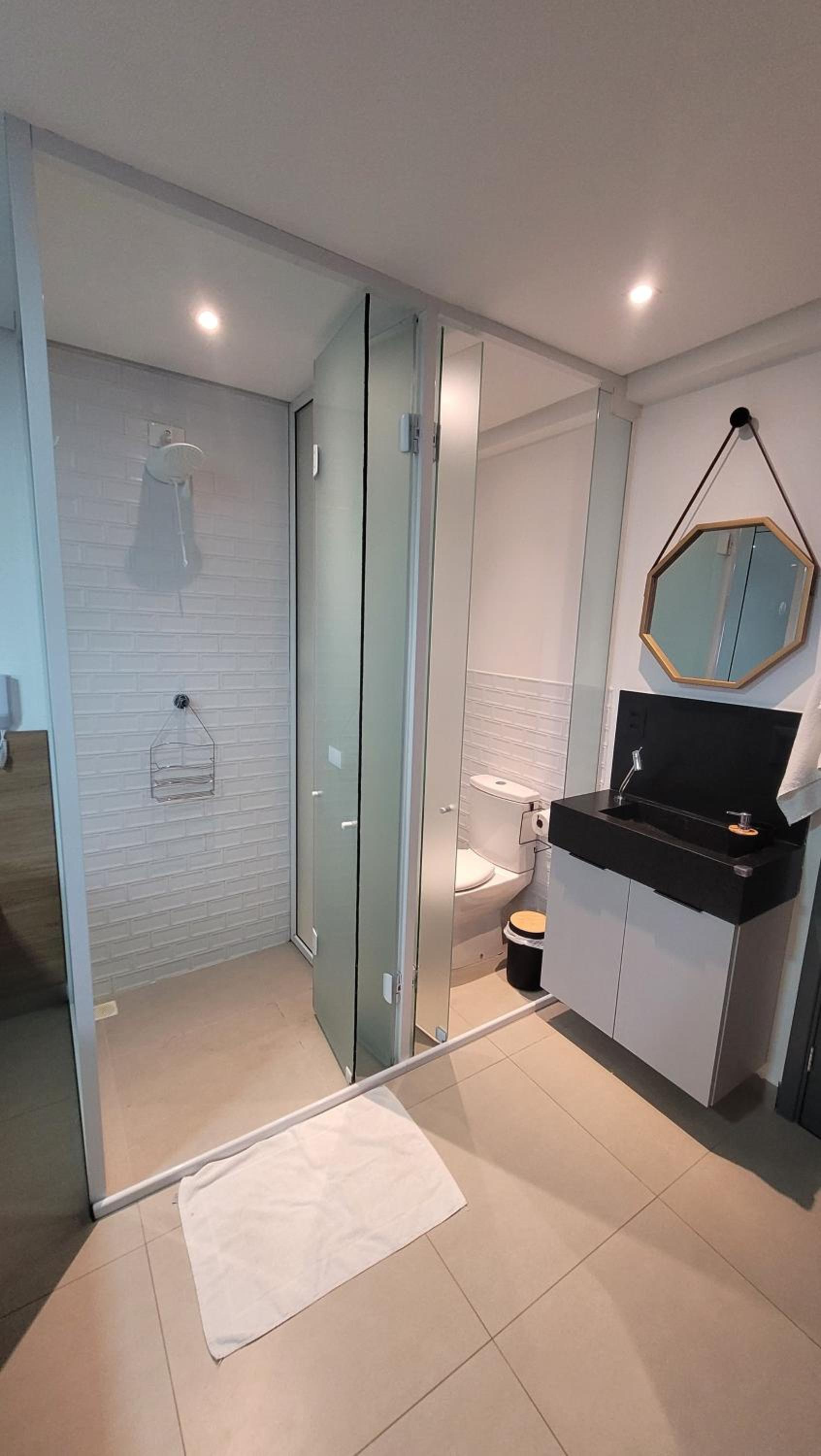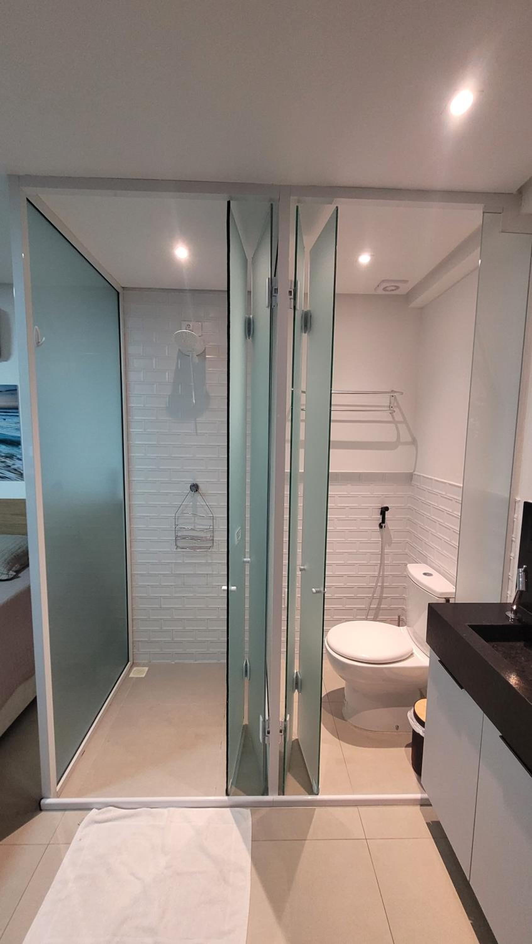 Quarto mal planejado, banheiro de vidro dentro do quarto com portas de correr e individual privado da ducha que deixa ambos pequenos e dificil de abrir e fechar as portas