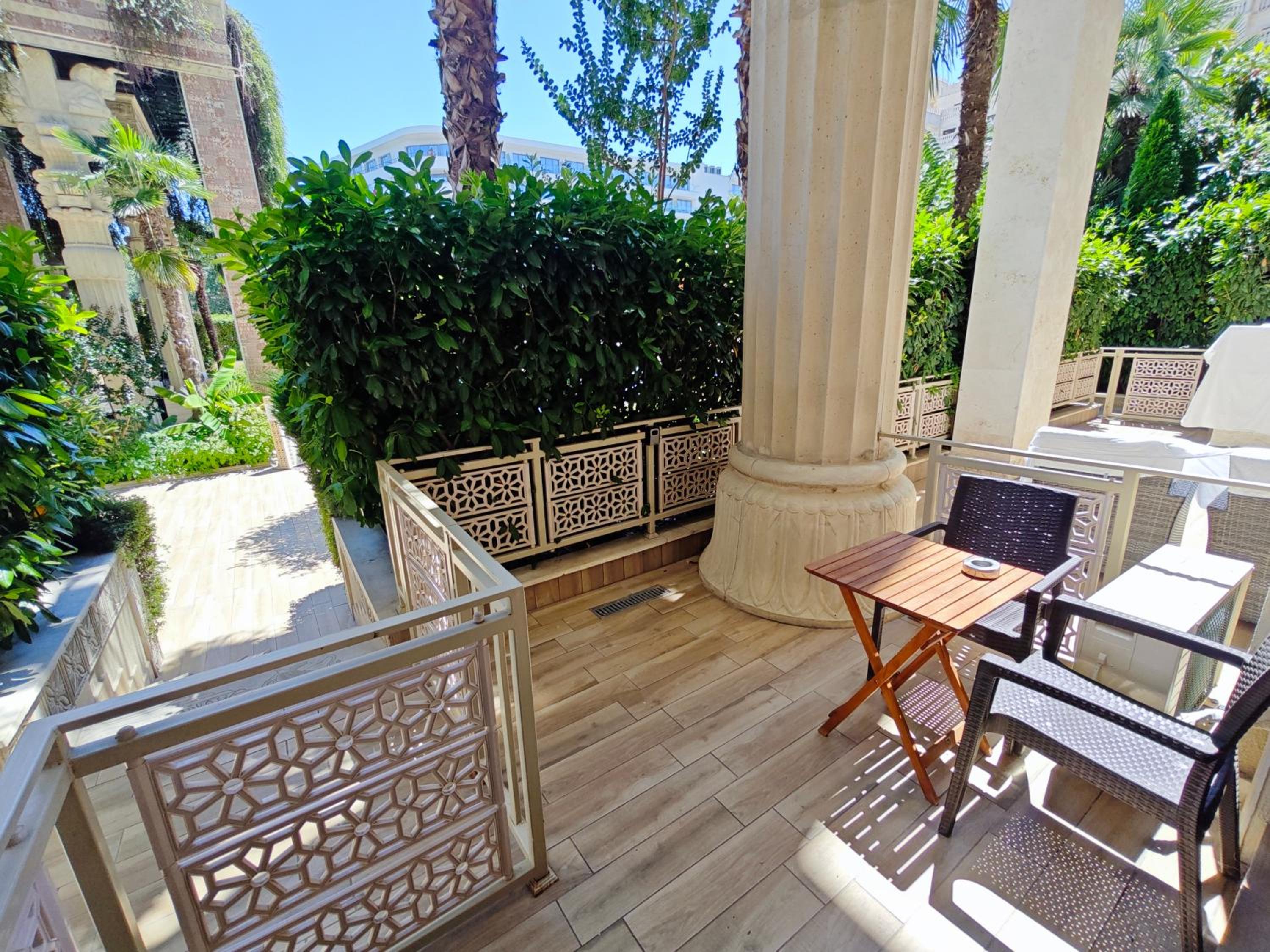At the very beachfront, on the territory of a big hotel with many pools, lot’s of attractions and restaurants nearby. The apartment is very stylish, new, with a coffee machine and a washer. New bed lining and good quality towels. Big fridge. The owner is very responsible and nice. Everything you need during your vacation is there