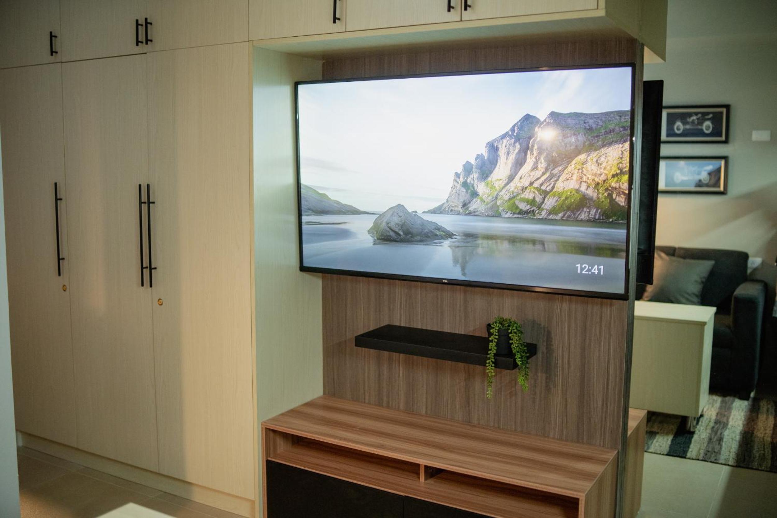 Modern Amenities: Relax in a comfortable queen bed while watching your favorite shows on the 50-inch TV with Netflix access.