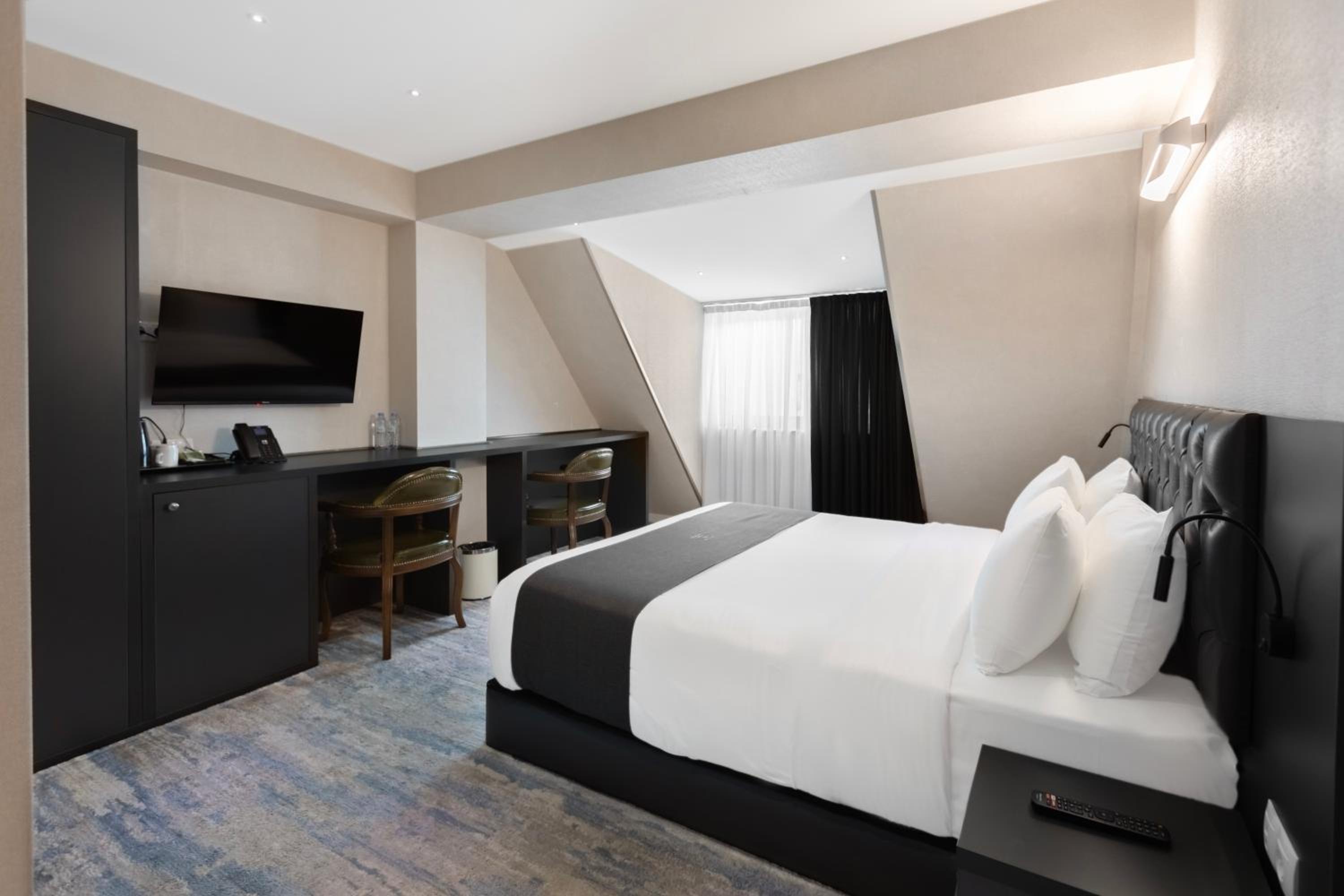 Indulge in our rooms featuring private bathrooms, city views, flat-screen TVs, and ergonomic workstations for your comfort.
