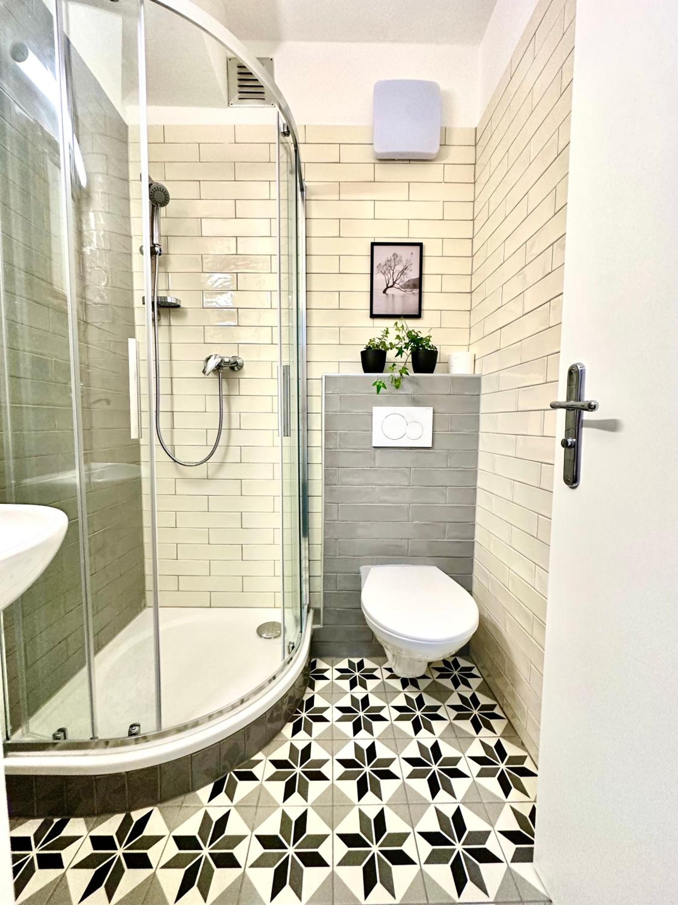 Malý sprchový kout, přitom koupelna je velikostně naprosto v pohodě.