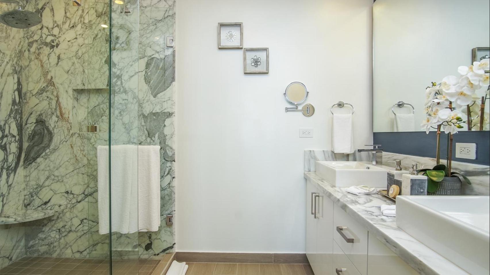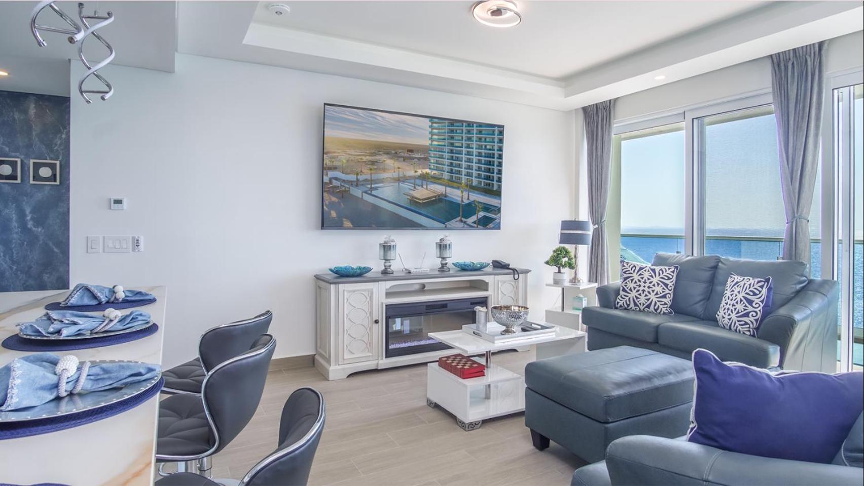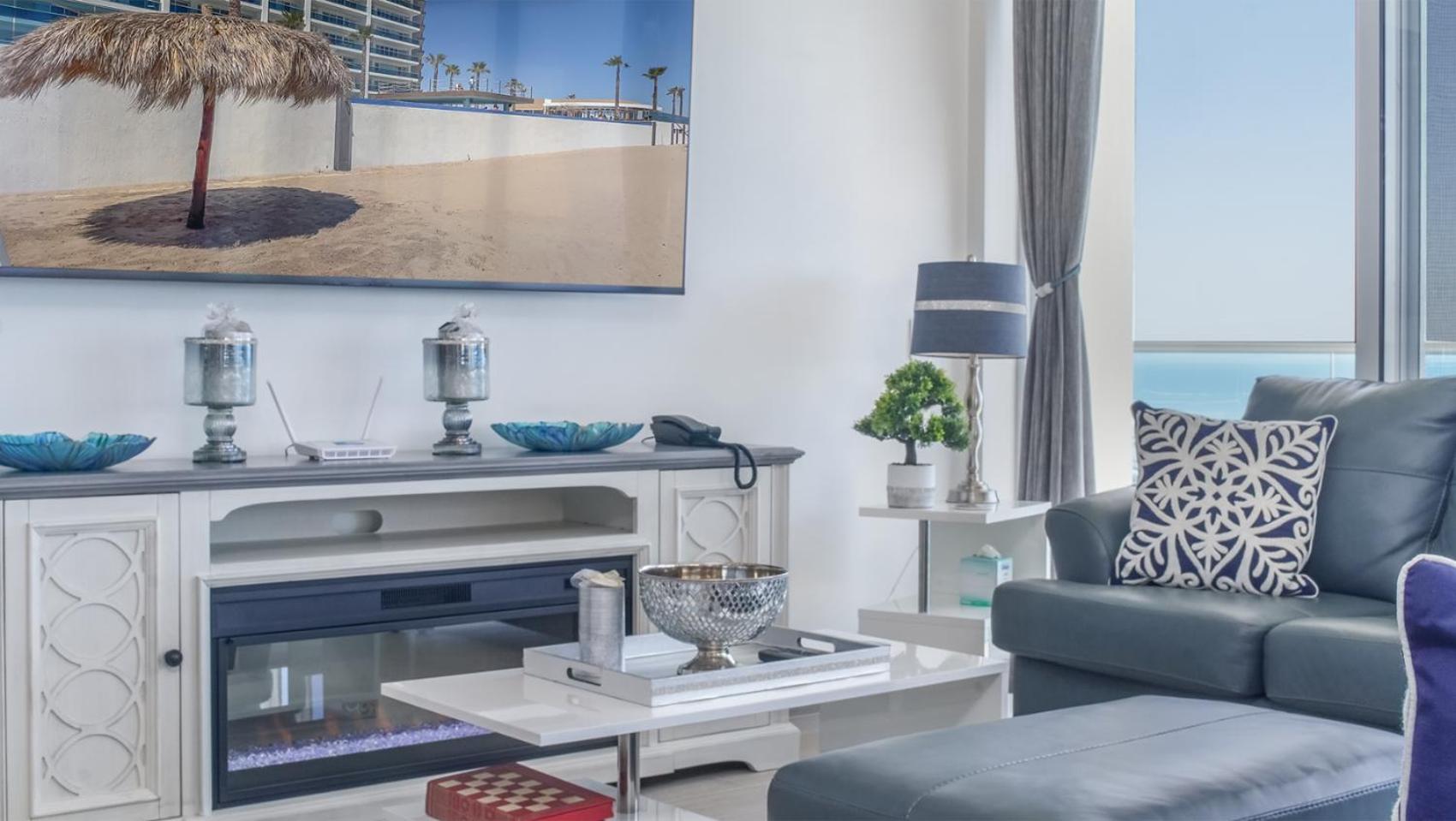 Experience comfort in our spacious 2-bedroom aparthotel with a fully equipped kitchen, flat-screen TV, and cozy fireplace.
