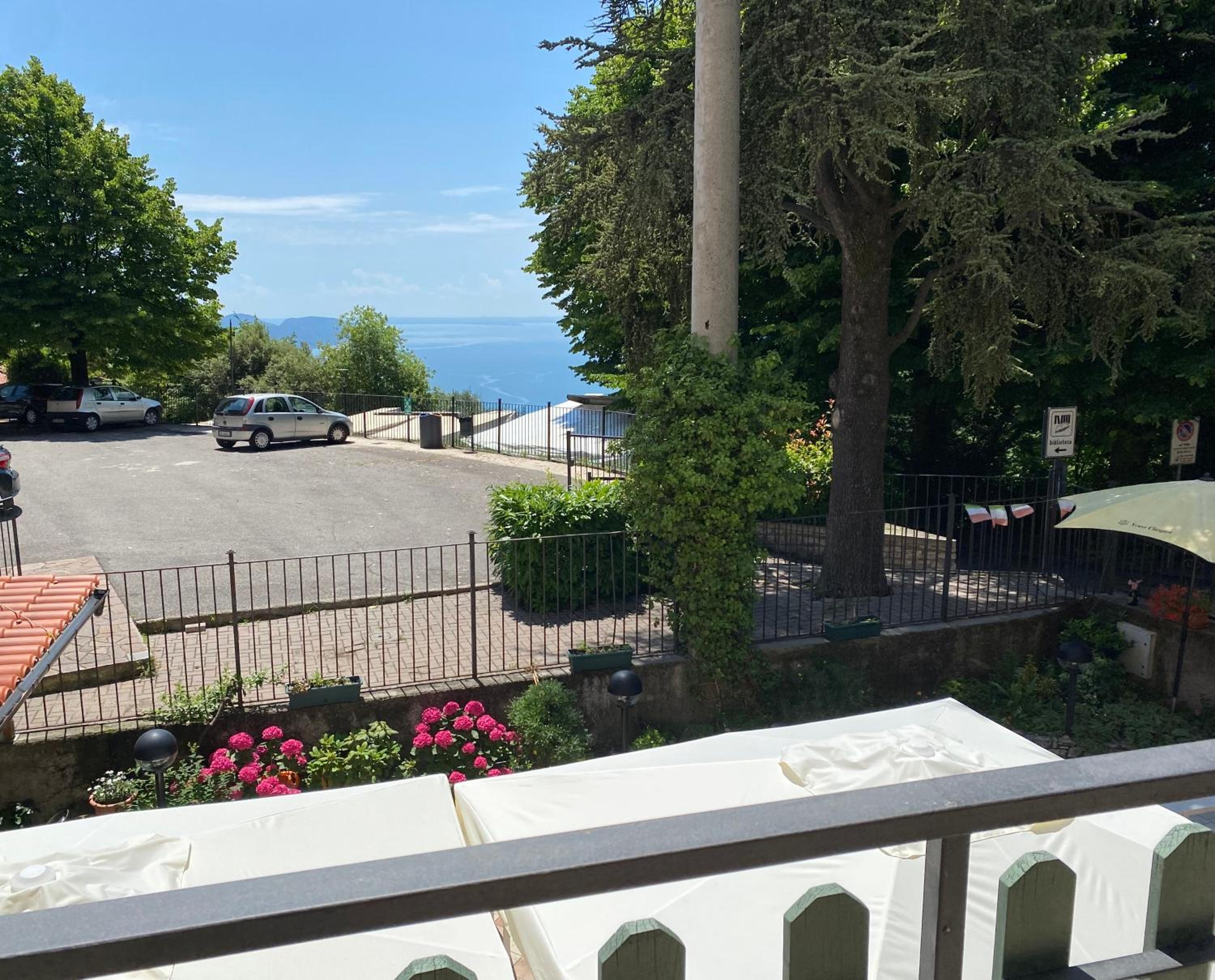 la camera ha il balcone con vista terrazza ristorante e la finestra latp parcheggio, quindi vista lago non accessibile