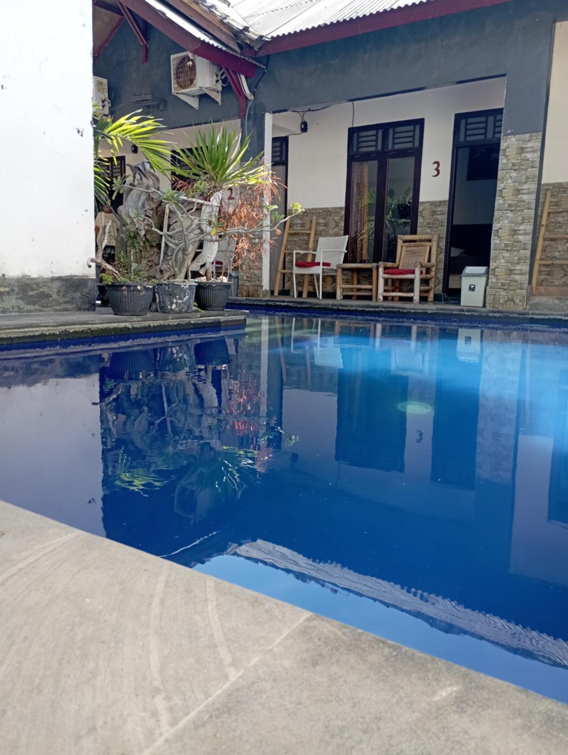 Camera ampia davanti alla piscina. Piscina molto bella e adatta anche ai bambini. Disponibilità e cortesia dello staff che ci ha fatto sentire come a casa. Colazione basica ma molto buona (uova strapazzate con fette tostate e scelta tra the o caffè). Posizione magnifica vicino a qualsiasi cosa (warung.,pub,ristoranti,bar, spiagge,) vicinissimo alla zona del porto. Servizio di lavanderia a prezzi competitivi con tempi in giornata. Wifi in stanza veloce e molto stabile. Grazie ai contatti del boss Ricky siamo riusciti a organizzare il soggiorno della settimana dopo a Lombok.