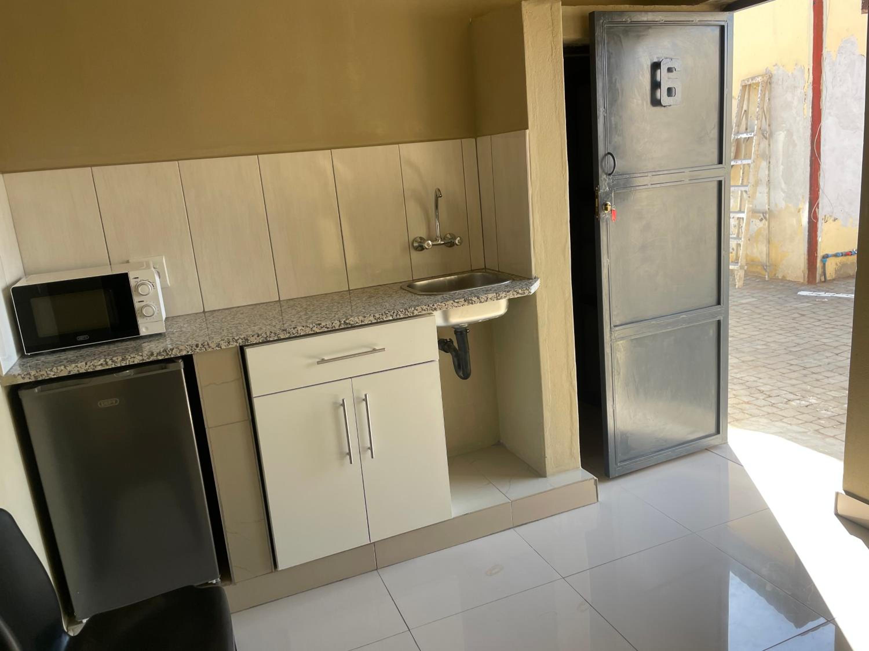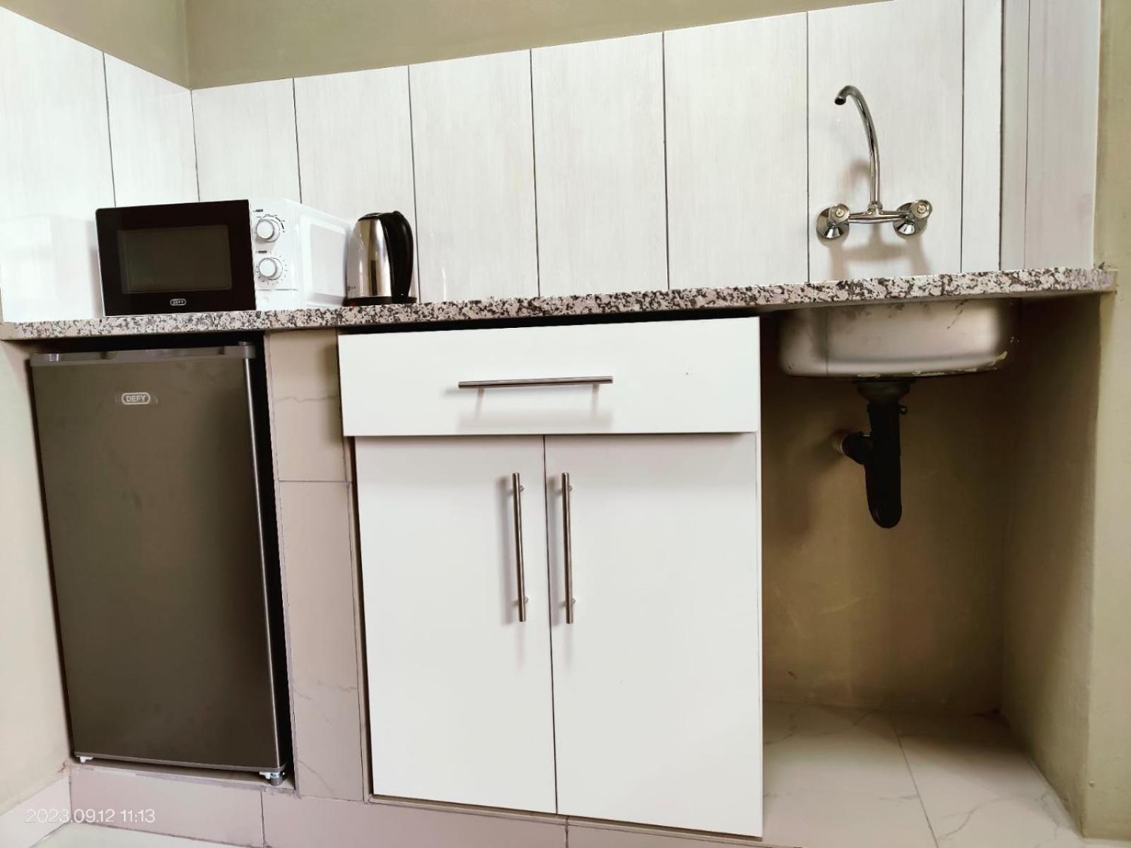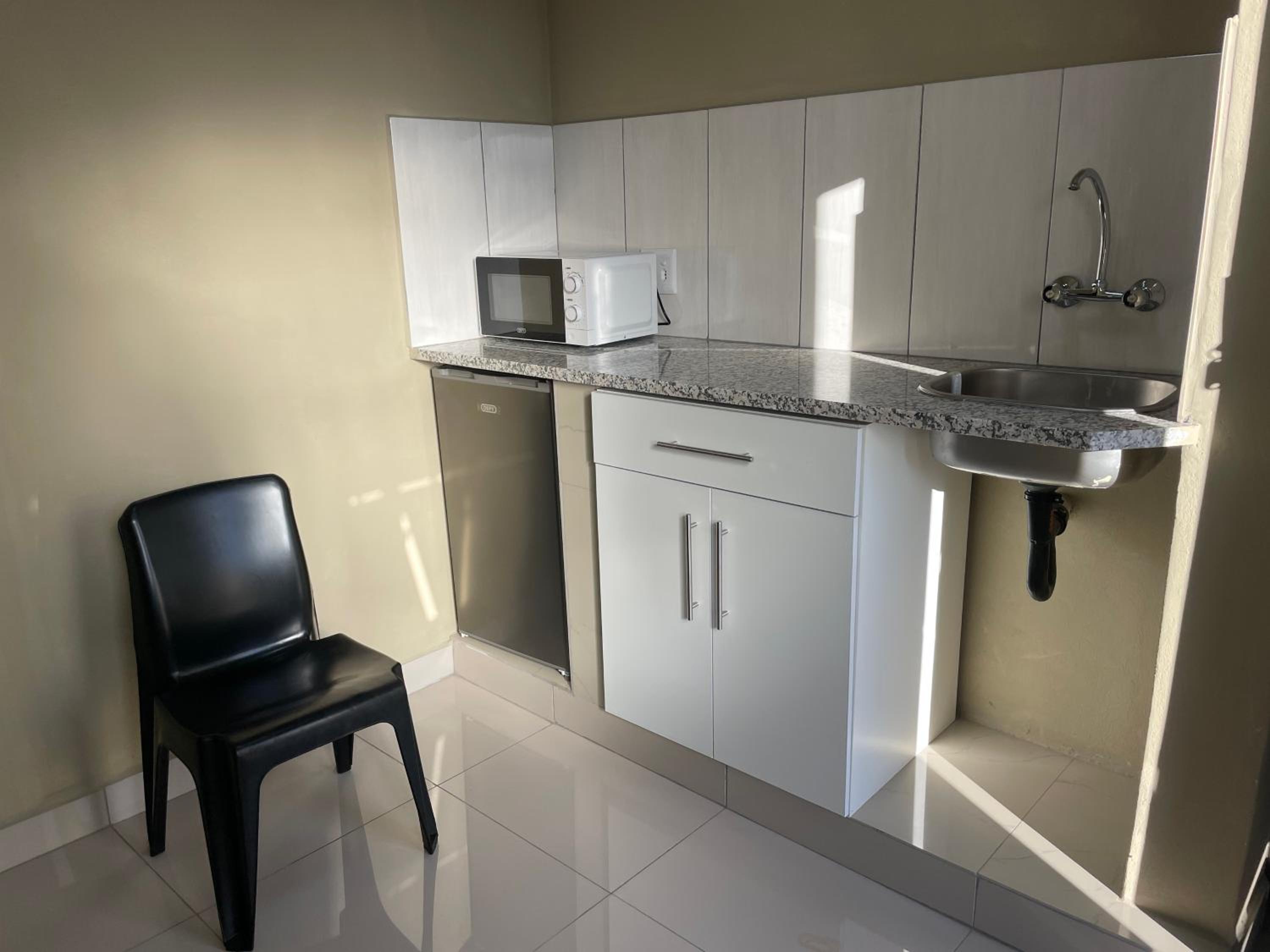 "The kitchen area": Microwave was also DIRTY from outside to inside, kettle had dust that looked very old. The countertop was oily and filthy, and the bar fridge was dirty it had some phutu leftovers, maybe from previous occupiers. The remotes for the aircon and TV did not have working batteries. AND THERE'S ALSO MOLD on the walls.