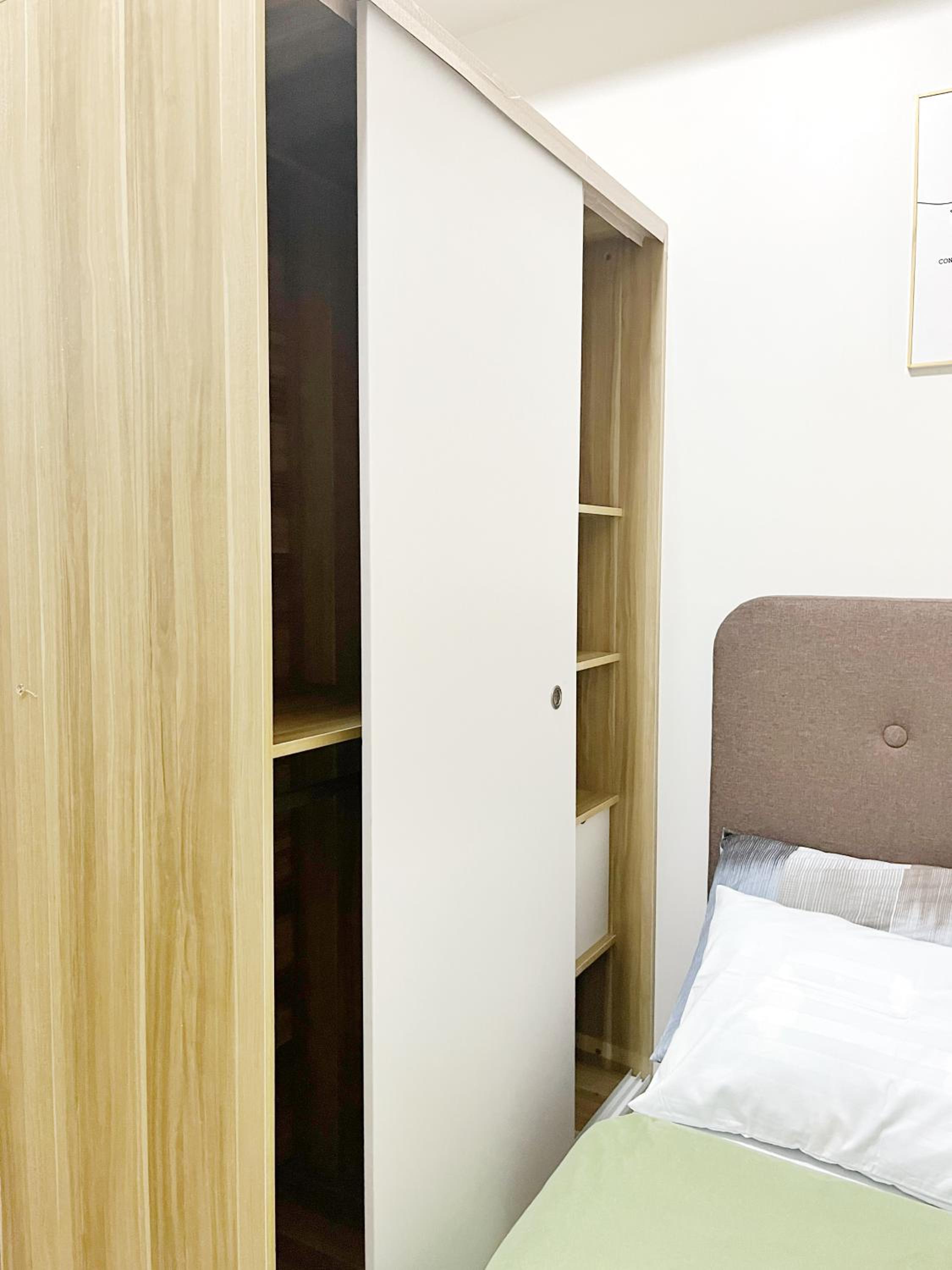 No cabinet or wardrobe.